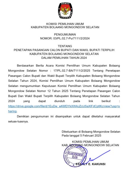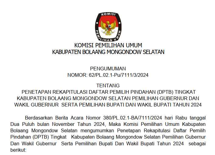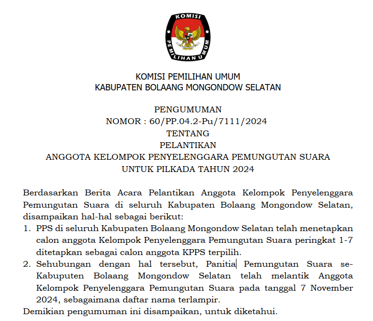 Sehubungan dengan hal tersebut, Panitia Pemungutan Suara se-Kabuputen Bolaang Mongondow Selatan telah melantik Anggota Kelompok Penyelenggara Pemungutan Suara pada tanggal 7 November 2024, sebagaimana daftar nama terlampir.