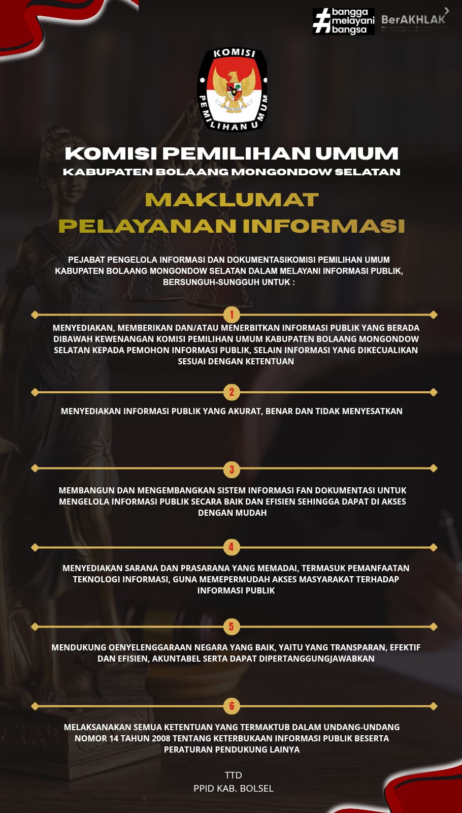 Maklumat ini disampaikan sebagai bentuk kesungguhan KPU Bolsel dalam meningkatkan kualitas layanan informasi publik serta memastikan bahwa akses masyarakat terhadap informasi kepemiluan berjalan mudah, terbuka, dan sesuai dengan ketentuan perundang-undangan.