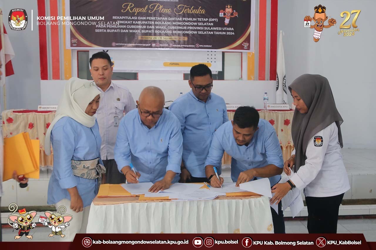 Halo #TemanPemilih, KPU Kab. Bolaang Mongondow Selatan melaksanakan Rapat Pleno Rekapitulasi Daftar Pemilih Tetap (DPT) Kab. Bolaang Mongondow Selatan Pada Pemilihan Kepala Daerah Tahun 2024 pada Kamis (19/9). Kegiatan yang digelar di Balai Desa Popodu ini mengundang, Pimpinan Forkopimda, Bawaslu Bolsel, dan Ketua dan Anggota PPK di 7 Kecamatan.