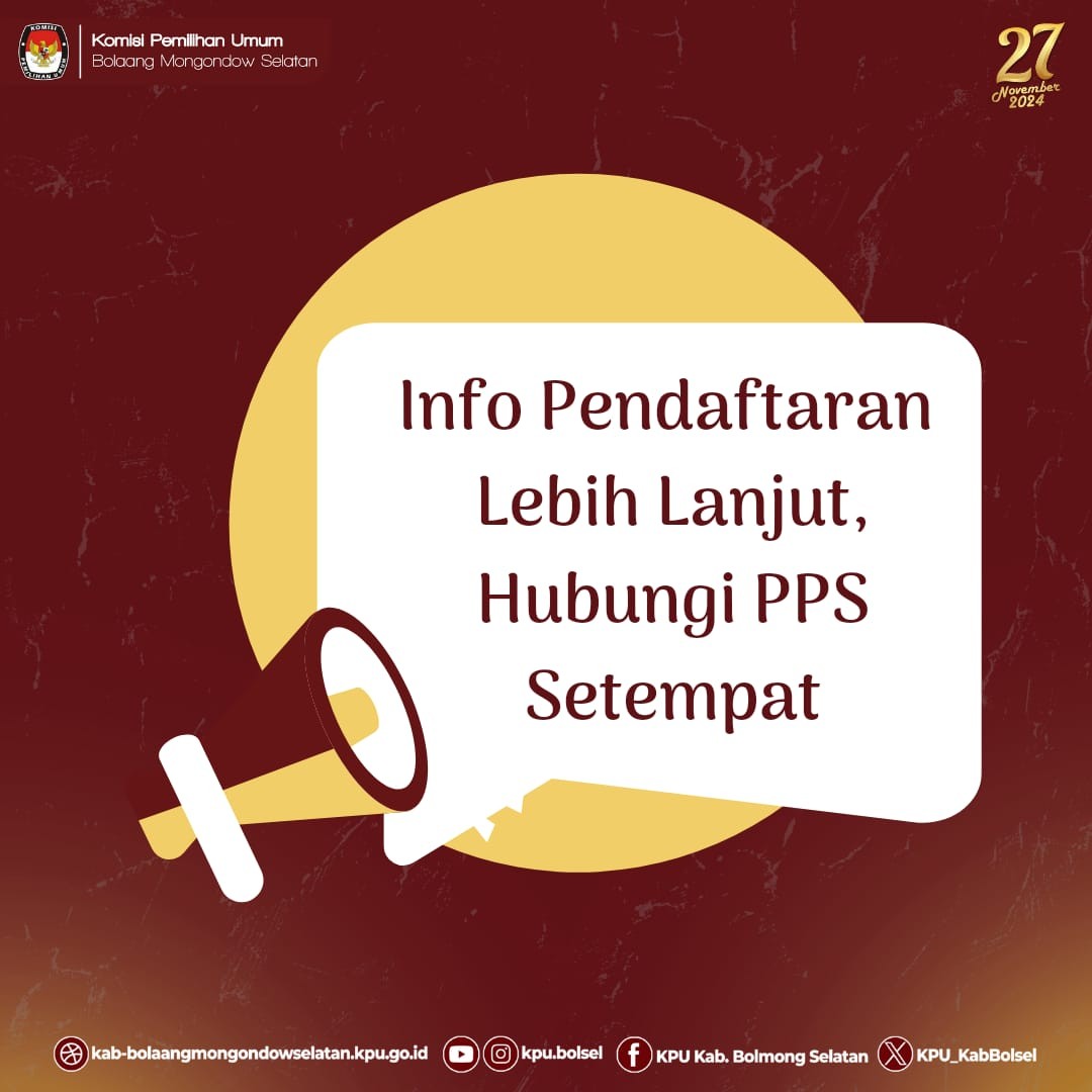 Yuk daftarkan dirimu dan mari ikut berpartisipasi untuk pemutakhiran data pemilih Bolsel dalam rangka mensukseskan Pilkada Serentak tahun 2024.