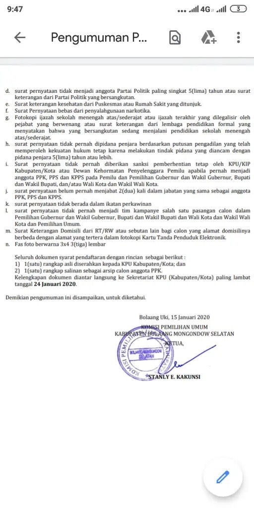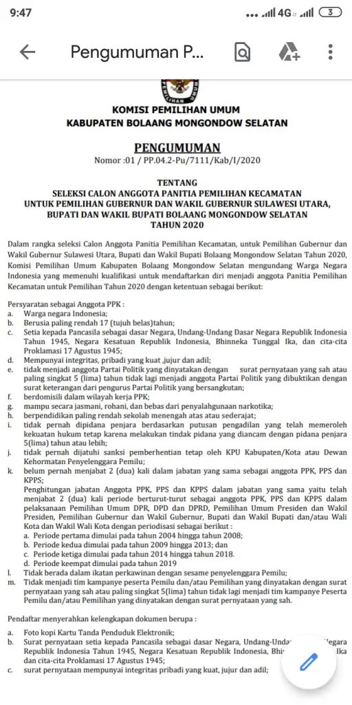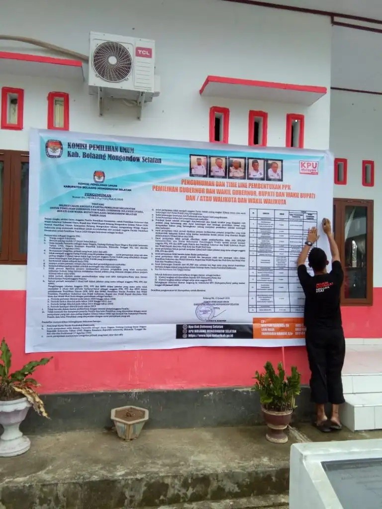 Rabu, 15 Januari 2020Komisi Peilihan Umum Kabupaten Bolaang Mongondow Selatan telah mengumumkan Seleksi Calon Anggota Panitia Pemilihan Kecamatan (PPK) untuk Pemilihan Gubernur dan Wakil Gubernur, Bupati dan Wakil Bupati dan/atau Walikota dan Wakil Walikota tahun 2020.