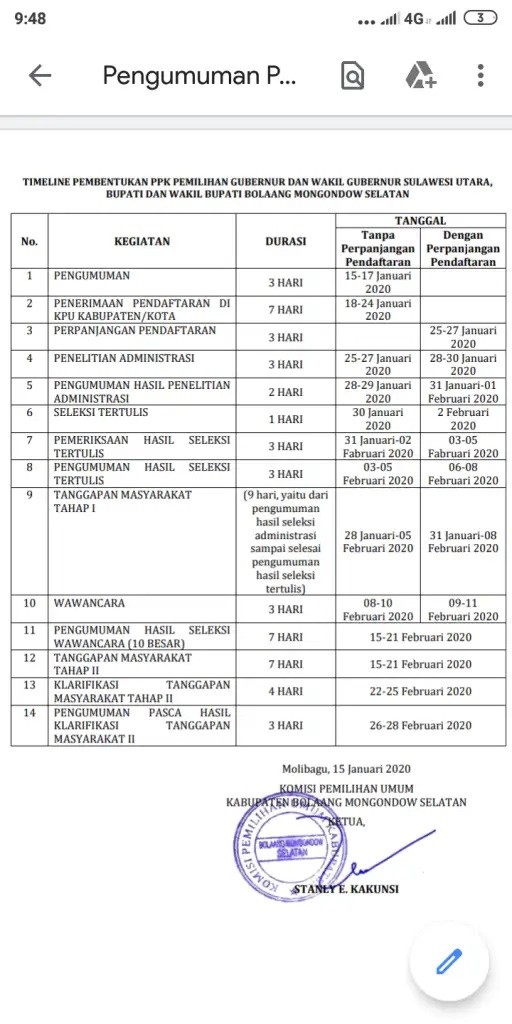Pengumuman Nomor :01 / PP.04.2-Pu/7111/Kab/I/2020