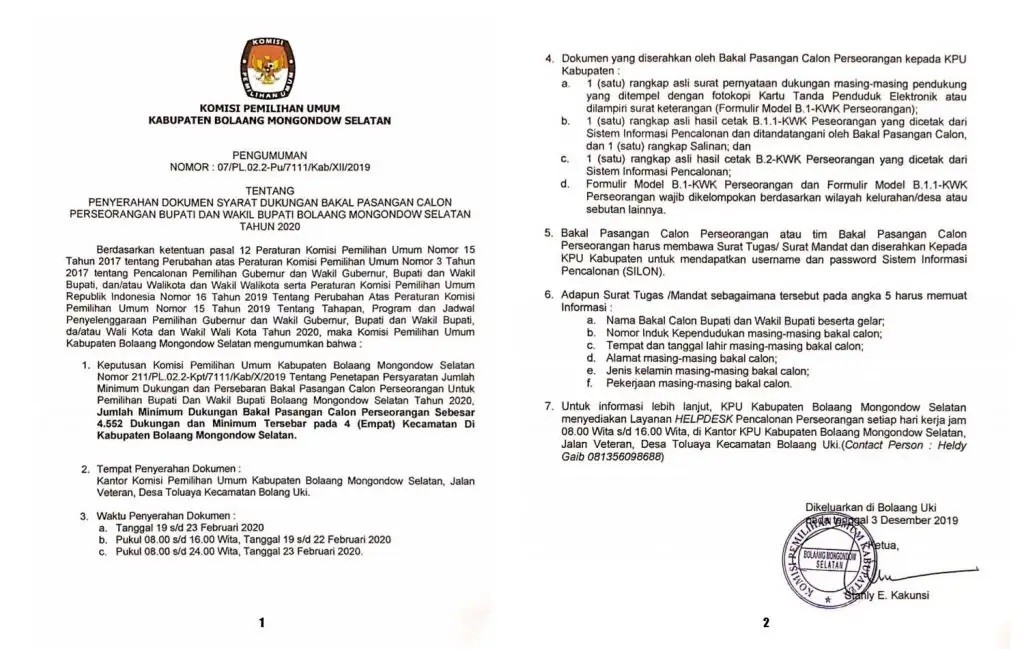 Berdasarkan ketentuan Pasal 12 Peraturan Komisi Pemilihan Umum Nomor 15 Tahun 2017 tentang Perubahan atas Peraturan Komisi Pemilihan Umum Nomor 3 Tahun 2017 tentang Pencalonan Pemilihan Gubernur dan Wakil Gubernur, Bupati dan Wakil Bupati, dan/atau Wali Kota dan Wakil Wali Kota serta Peraturan Komisi Pemilihan Umum Republik Indonesia Nomor 16 tahun 2019 tentang Perubahan atas peraturan Komisi Pemilihan Umum Nomor 15 tahun 2019 tentang Tahapan, Program dan Jadwal Penyelenggaraan Pemilihan Gubernur dan Wakil Gubernur, Bupati dan Wakil Bupati, dan/atau Wali Kota dan Wakil Wali Kota Tahun 2020, maka Komisi Pemilihan Umum Kabupaten Bolaang Mongondow Selatan mengumumkan Penyerahan Dokumen Dukungan Bakal Pasangan Calon Perseorangan Bupati dan Wakil Bupati Kabupaten Bolaang Mongondow Selatan Tahun 2020, sebagaimana terlampir di bawah ini: