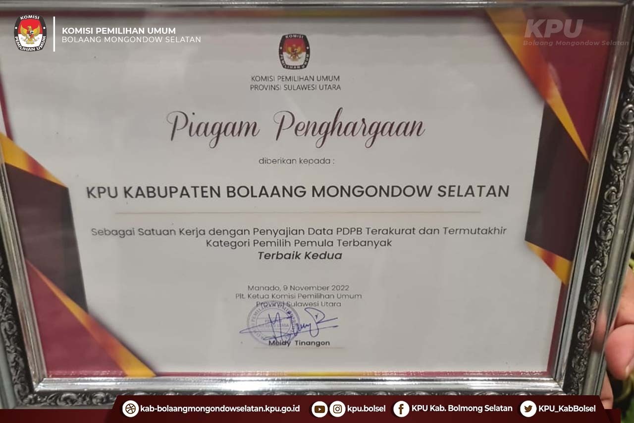 KPU Kabupaten Bolaang Mongondow Selatan raih penghargaan Terbaik Kedua sebagai Satuan Kerja dgn Penyajian Data PDPB Terakurat dan Termutakhir Kategori Pemilih Pemula Terbanyak se-Sulawesi Utara dalam kegiatan Rapat Koordinasi Persiapan Pemutakhiran Data Pemilih untuk Pemilu 2024 dan Evaluasi Pemutakhiran Data Pemilih Berkelanjutan bersama KPU Kabupaten/Kota Se Sulawesi Utara di Luwansa Hotel Manado, Selasa (8/11).