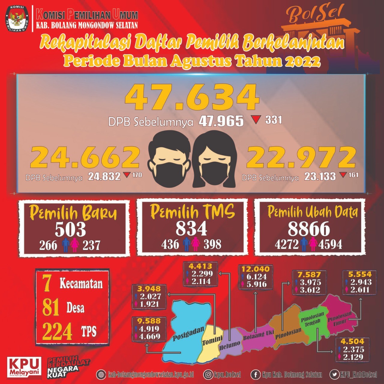 Komisi Pemilihan Umum Kabupaten Bolaang Mongondow Selatan laksanakan Rapat Pleno Penetapan Rekapitulasi Daftar Pemilih Berkelanjutan periode Agustus 2022, pada Jumat (2/9) pukul 10.00 WITA Pagi. Rapat Pleno yang dilaksanakan di Aula Sekretariat KPU Kabupaten Bolaang Mongondow Selatan ini dihadiri oleh Ketua, Anggota, serta Staf Operator pada KPU Kabupaten Bolaang Mongondow Selatan.