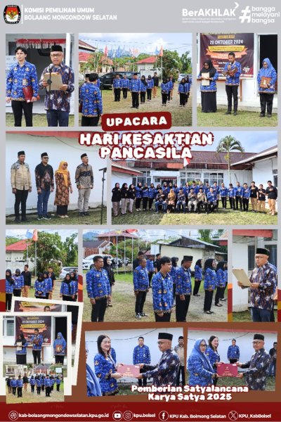Komisi Pemilihan Umum (KPU) Kabupaten Bolaang Mongondow Selatan menyelenggarakan Upacara Peringatan Hari Kesaktian Pancasila tahun 2025. Upacara ini berlangsung khidmat di halaman kantor KPU Bolsel. Ketua KPU Bolsel bertindak sebagai Inspektur Upacara, sementara Komandan Upacara dipercayakan kepada Kasubbag Keuangan, Umum, dan Logistik (KUL). Upacara ini dilaksanakan untuk memperingati nilai-nilai luhur Pancasila dan meningkatkan semangat kebangsaan serta pengabdian aparatur sipil negara di lingkungan KPU Bolsel. Kegiatan diawali dengan laporan Komandan Upacara kepada Inspektur Upacara, dilanjutkan pembacaan teks Pancasila, Pembukaan UUD 1945, serta pembacaan ikrar Hari Kesaktian Pancasila. Dalam rangkaian upacara tersebut juga dilaksanakan pemberian tanda kehormatan Satyalancana Karya Satya Tahun 2025 kepada dua pegawai KPU Bolsel, yakni Ibu Yessi Zusan Silfana Mentang, S.E. selaku Kasubbag SDM, dan Ibu Lani Naue. Penganugerahan ini merupakan bentuk apresiasi pemerintah atas pengabdian dan loyalitas para ASN di lingkungan KPU Bolsel. Melalui peringatan Hari Kesaktian Pancasila ini, diharapkan seluruh jajaran KPU Bolsel semakin meneguhkan komitmen untuk terus bekerja profesional dan berintegritas sesuai nilai-nilai Pancasila.