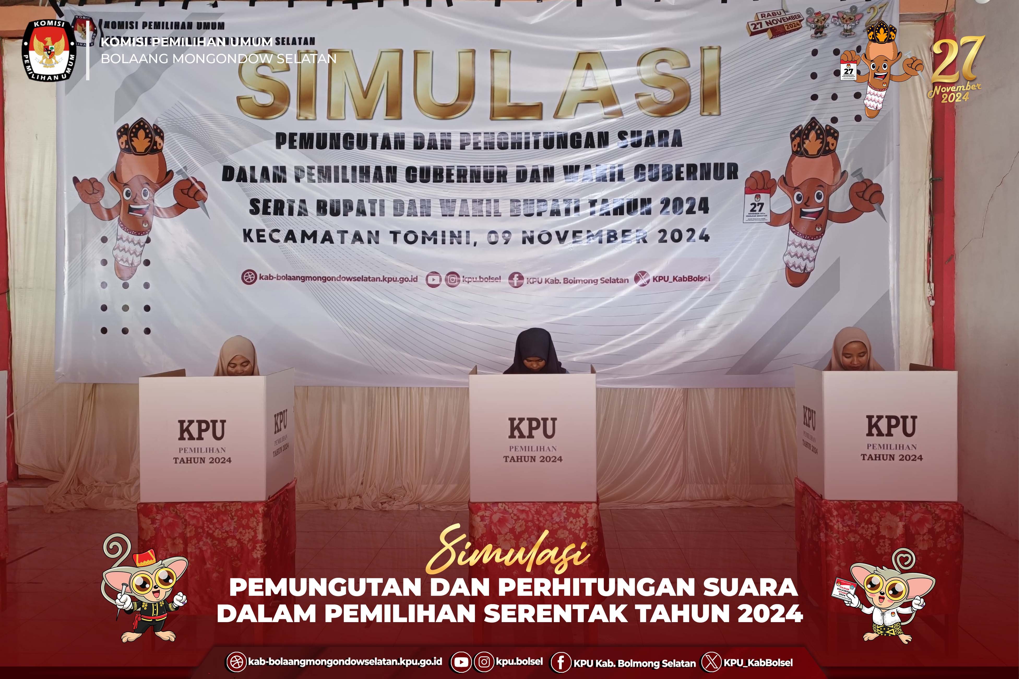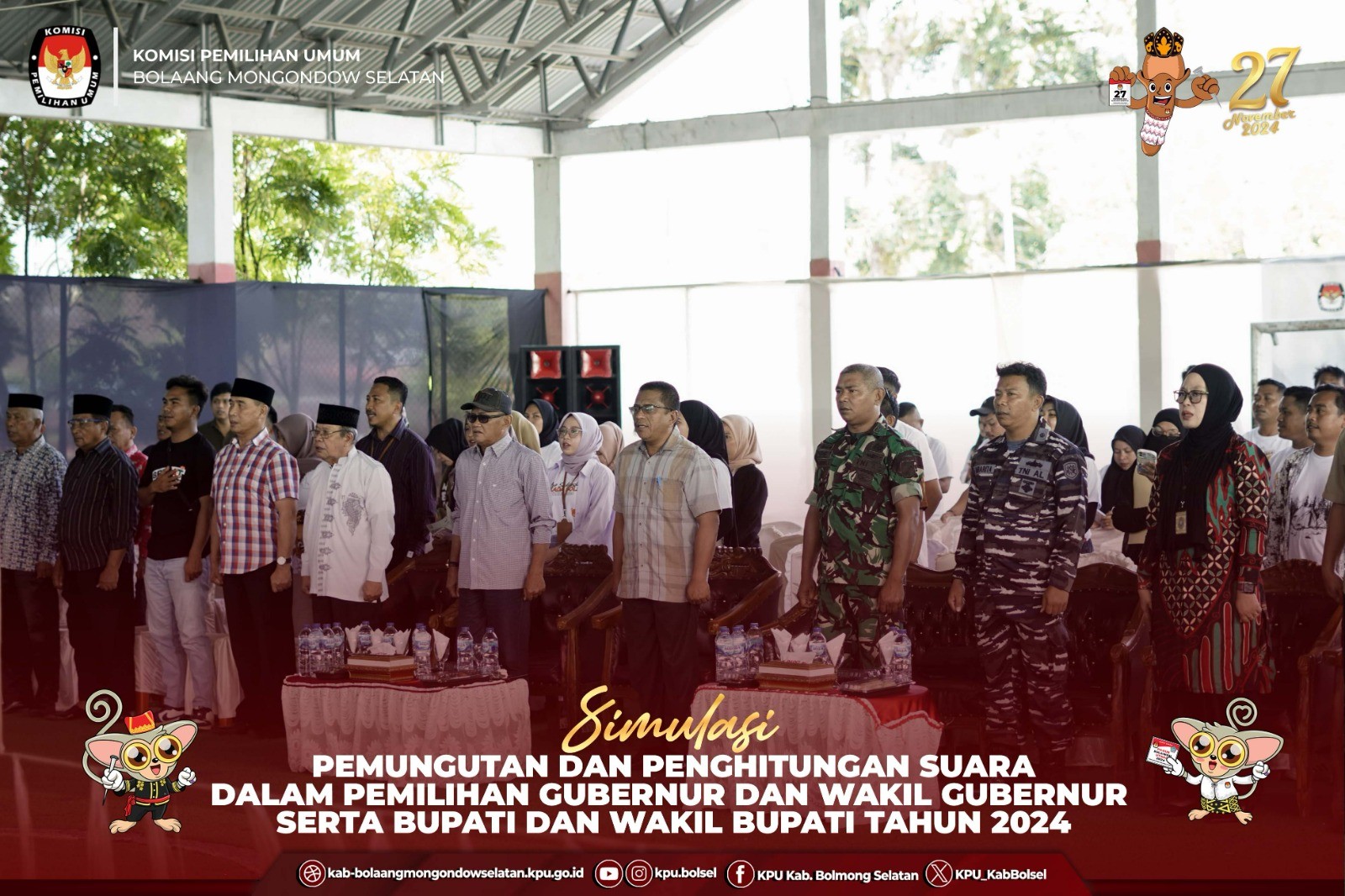 Halo #TemanPemilih, KPU Kab. Bolaang Mongondow Selatan melaksanakan Simulasi Pemungutan dan Penghitungan Suara dalam Pemilihan Gubernur dan Wakil Gubernur serta Bupati dan Wakil Bupati Tahun 2024 pada Kamis (24/10) di Lapangan Futsal, Desa Toluaya. Kegiatan ini menghadirkan Pimpinan Forkopimda, Tim pasangan calon, Pimpinan Partai Politik, Pimpinan Organisasi Kemasyarakatan dan Kepemudaan, Tokoh Masyarakat, Media, Ketua dan Anggota PPK dan PPS. Kegiatan ini bertujuan untuk memberikan gambaran terkait bagaimana prosedur pelaksanaan Pemungutan dan Penghitungan suara di TPS nantinya.