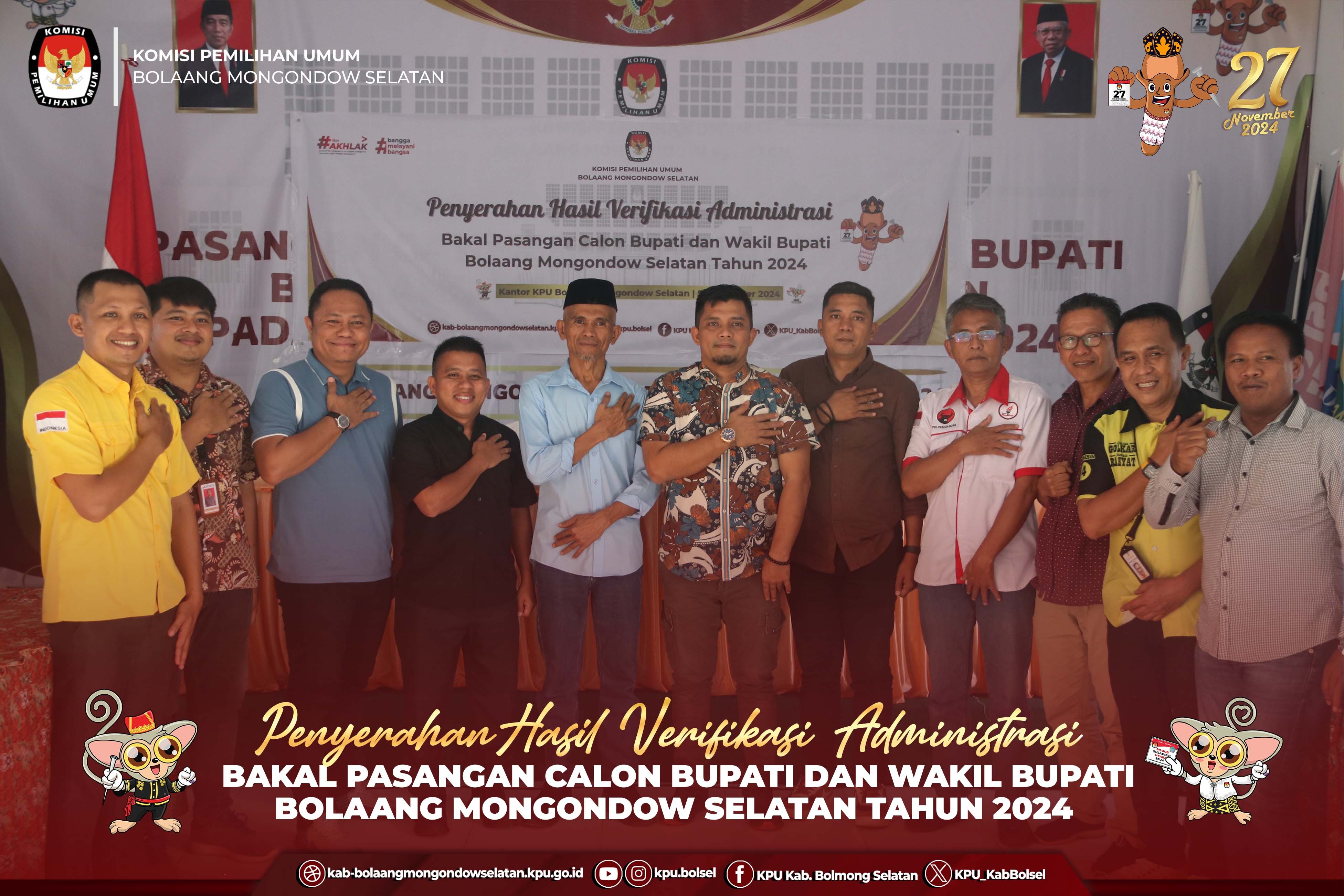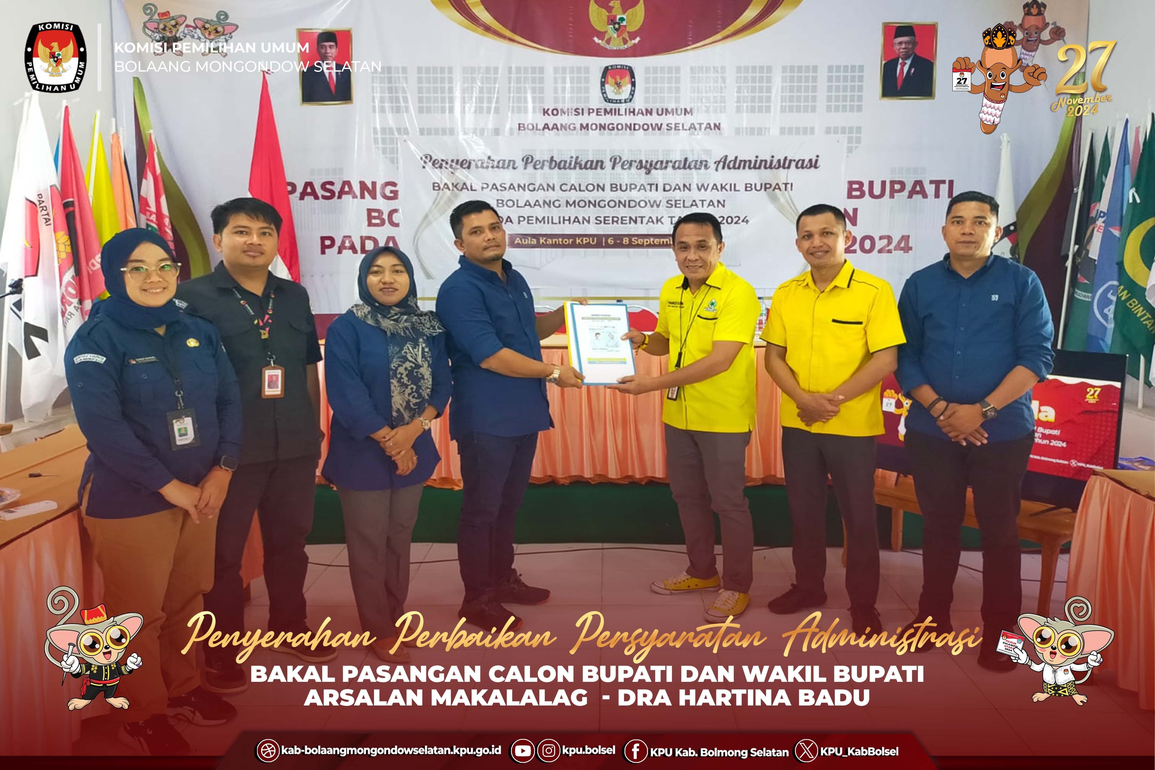 Halo #TemanPemilih, pada hari terakhir (8/9) KPU Bolaang Mongondow Selatan menerima penyerahan perbaikan persyaratan administrasi Bakal Pasangan Calon Bupati dan Wakil Bupati atas nama Arsalan Makalalag S.Pd., M.M dan Dra. Hartina Badu di Aula Kantor KPU Bolaang Mongondow Selatan pada pukul 10.24 WITA. Penyerahan Dokumen perbaikan persyaratan ini diwakili oleh petugas penghubung dan operator dari bakal pasangan calon bupati dan wakil bupati yang diusul oleh partai Golkar dan Nasdem. Pada proses penyerahan ini dihadiri oleh Ketua divisi teknis penyelenggara Fijey Bumulo selaku koordinar pendaftaran, Ketua Divisi Hukum dan Pengawasan Liswan Lumali, Ketua Divisi Sosdiklih, Parmas dan SDM Marlia Lumali serta diawasi langsung oleh Bawaslu Bolaang Mongondow Selatan. Setelah proses serah terima dokumen perbaikan dilakukan oleh Perwakilan dari pasangan bakal calon bupati dan wakil bupati kepada KPU Bolaang Mongondow Selatan selanjutnya langsung diverifikasi oleh tim verifikator KPU Bolsel yang turut serta disaksikan oleh bawaslu. Dalam proses penyerahan perbaikan persyaratan administrasi ini, KPU Bolsel juga menghubungi bapak Arsalan Makalalag dan Ibu Hartina Badu selaku Bakal Pasangan Calon Bupati dan Wakil Bupati untuk mengkonfirmasi bahwa dokumen yang diserahkan benar-benar merupakan dokumen asli yang kemudian proses penyerahan ini diwakili oleh Petugas Penghubung dan Operator. Selain bakal pasangan calon, KPU Bolsel bersama bawaslu juga ikut melakukan video call kepada pimpinan partai politik pengusul dalam hal ini ketua dan sekretaris dari partai Golkar dan Partai Nasdem. Dengan diserahkannya dokumen perbaikan persyaratan administrasi dari tim bakal pasangan calon bupati dan wakil bupati kepada KPU Bolsel, selanjutnya KPU Bolsel akan menindaklanjuti dengan melakukan proses penelitian terhadap dokumen penelitian perbaikan persyaratan yang telah diserahkan. #KPUMelayani #PilkadaSerentak2024