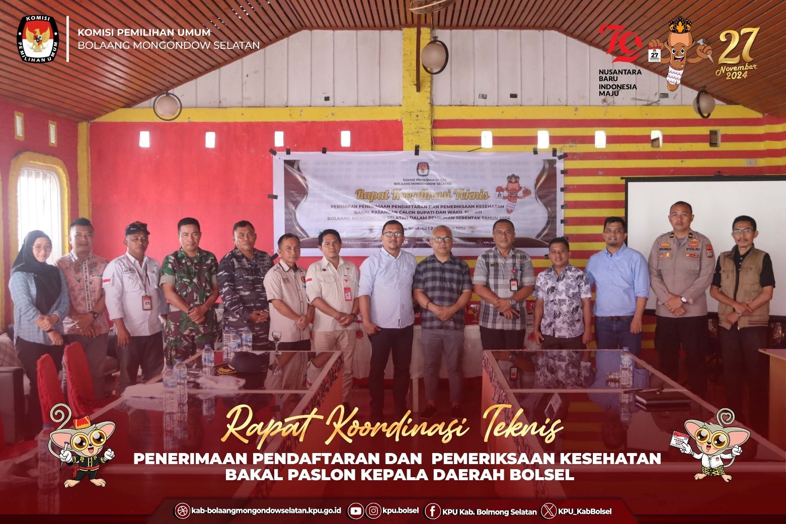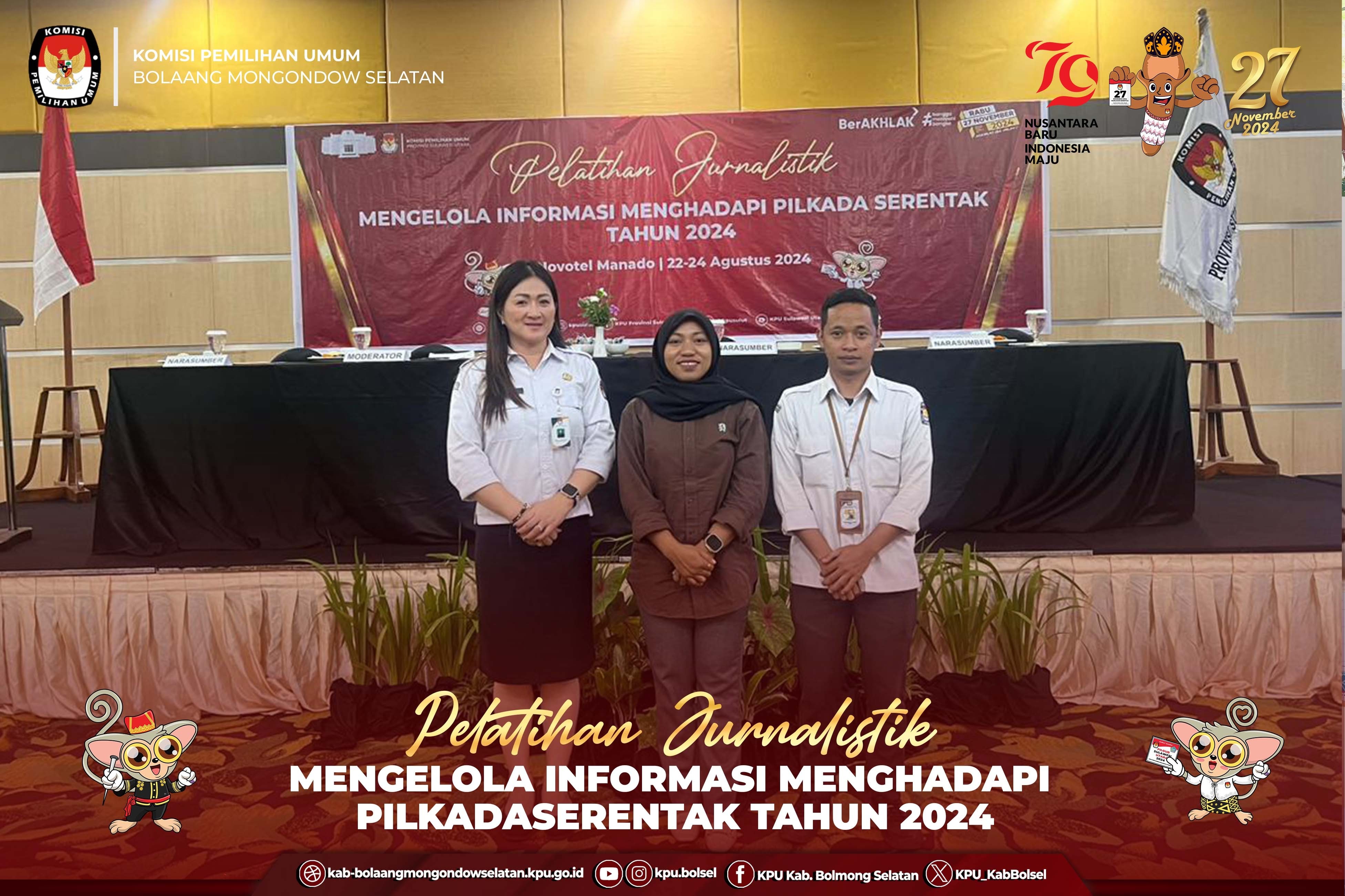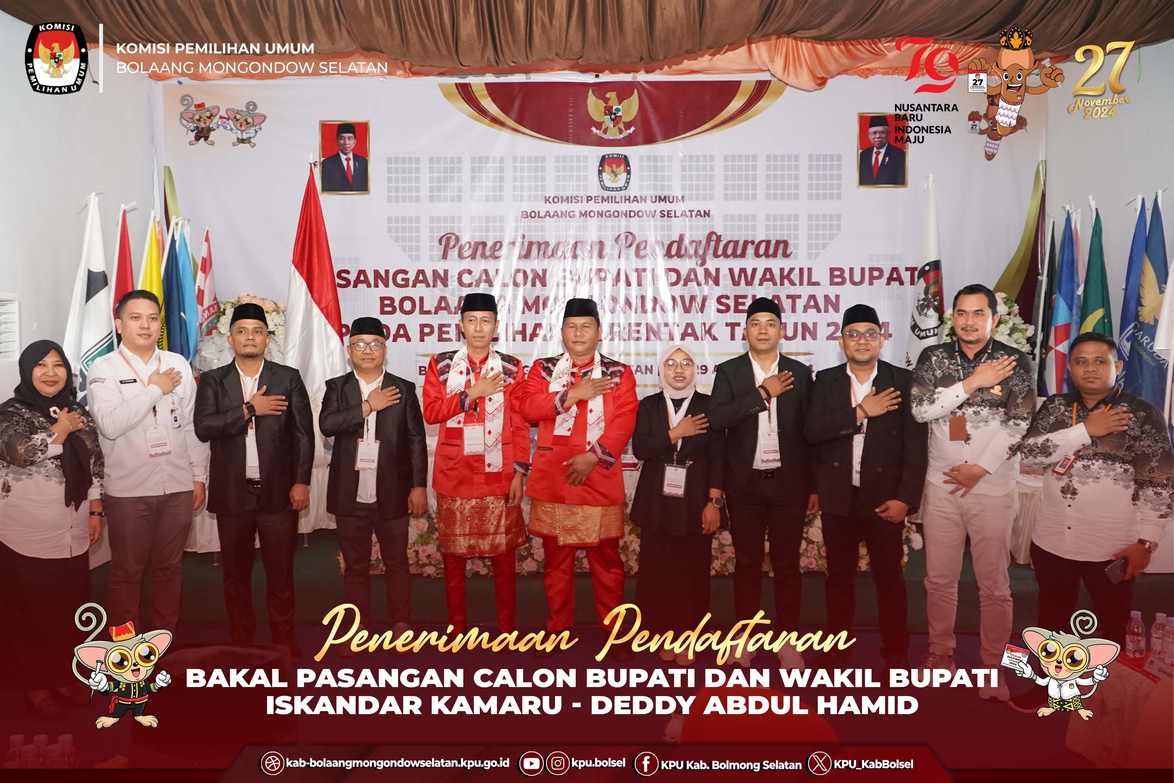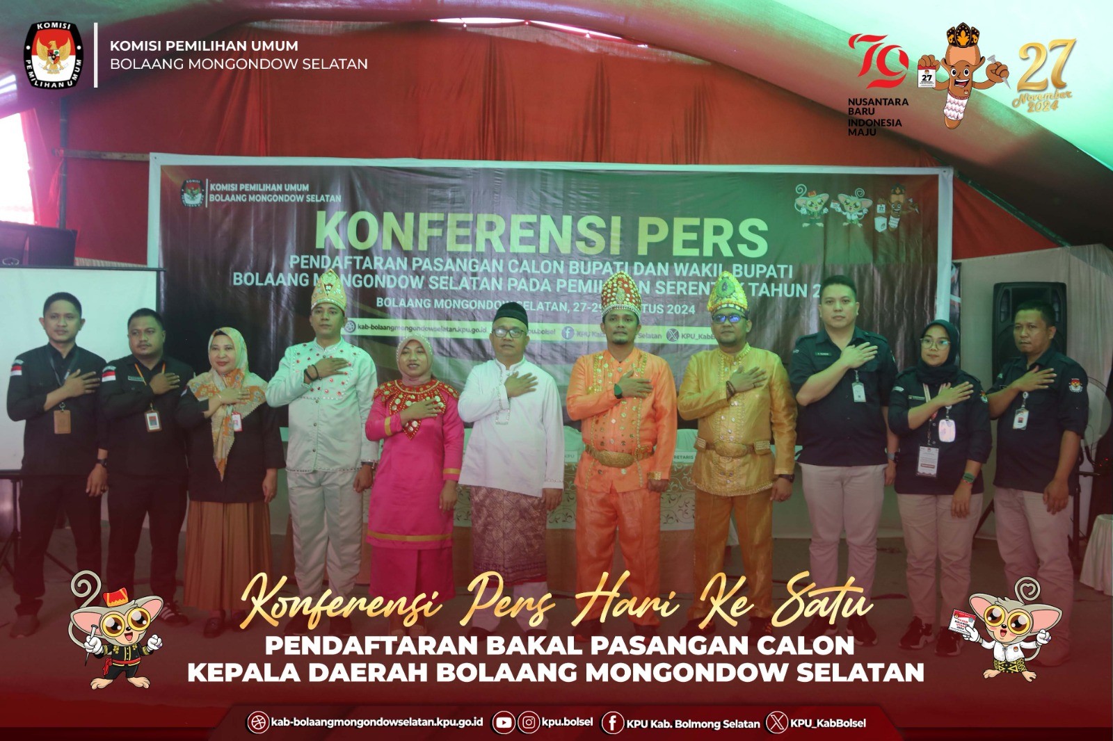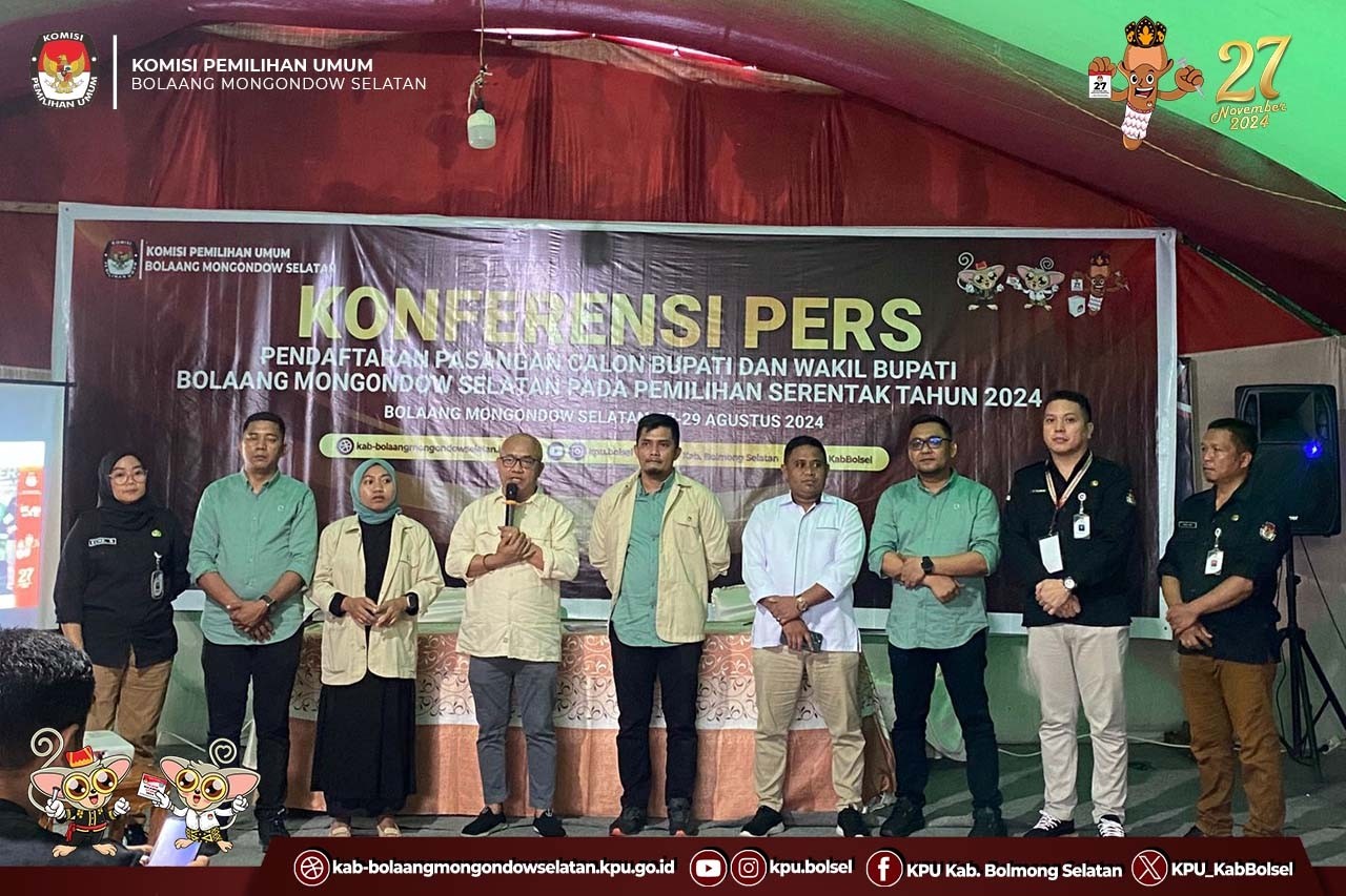 Halo #Temanpemilih, KPU Kab. Bolaang Mongondow Selatan melaksanakan Konferensi Pers Hari ke 2 Pendaftaran Bakal Calon Bupati dan Wakil Bupati Bolaang Mongondow Selatan Tahun 2024 pada Rabu (28/9) di Halaman Kantor KPU Bolaang Mongondow Selatan. Konferensi pers ini merupakan salah satu bentuk keterbukaan KPU Bolsel terhadap proses dan progres penerimaan Pendaftaran Bakal Calon Bupati dan Wakil Bupati Bolaang Mongondow Selatan Tahun 2024. Di depan Media, Ketua KPU Bolsel, Stanly E. Kakunsi yang didampingi oleh Anggota dan Sekretaris KPU serta Bawaslu Bolsel, menyampaikan progress pendaftaran Bakal Calon Bupati dan Wakil Bupati hingga pelaksanaan pada hari ke-2. Beliau menyampaikan, "Hingga hari ini hingga pukul 16.00 WITA, Belum ada satupun Bakal Calon Bupati dan Wakil Bupati Bolaang Mongondow Selatan yang melakukan pendaftaran", Ujarnya. Lebih lanjut Eskol menyampaikan "Terkait dengan Pendaftaran pada Esok Hari atau di hari terkahir, KPU Bolsel telah menerima Pemberitahuan dari Partai PDI Perjuangan hari ini terkait dengan pemberitahuan Jadwal Pendaftaran yang akan dilakukan Esok hari Pukul 09.00 WITA", Tutupnya. Esok atau tepatnya Kamis (29/8) adalah hari terakhir Pendaftaran, dan oleh KPU Bolsel berdasarkan regulasi, akan membuka pendaftaran Bakal Calon Bupati dan Wakil Bupati Bolsel Tahun 2024 hingga pukul 23.59 WITA. #KPUMelayani #PemilhanSerentak2024