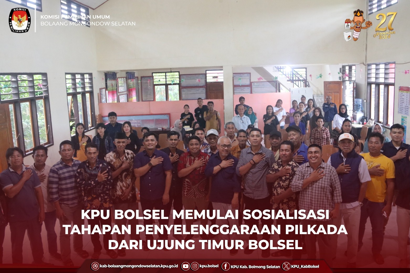 Halo #TemanPemilih, KPU Kab. Bolaang Mongondow Selatan melaksanakan Kegiatan Sosialisasi Tahapan Penyelenggaraan Pemilihan Kepala Daerah Seretak Tahun 2024 pada Selasa (9/7) di Balai Desa Dumagin A, Kec. Pinolosian Timur. Kegiatan yang mengundang sejumlah segmen Masyarakat mulai dari Tokoh Masyarakat, Perempuan, Tokoh Agama, Pemilih Pemula dan Disabilitas bertujuan untuk mengedukasi masyarakat terkait Tahapan Pilkada yang telah, sedang, dan akan dilaksanakan oleh KPU Kab. Bolaang Mongondow Selatan kaitannya dengan Pemilihan Bupati dan Wakil Bupati Bolaang Mongondow Selatan yang akan dilaksanakan pada 27 November mendatang.