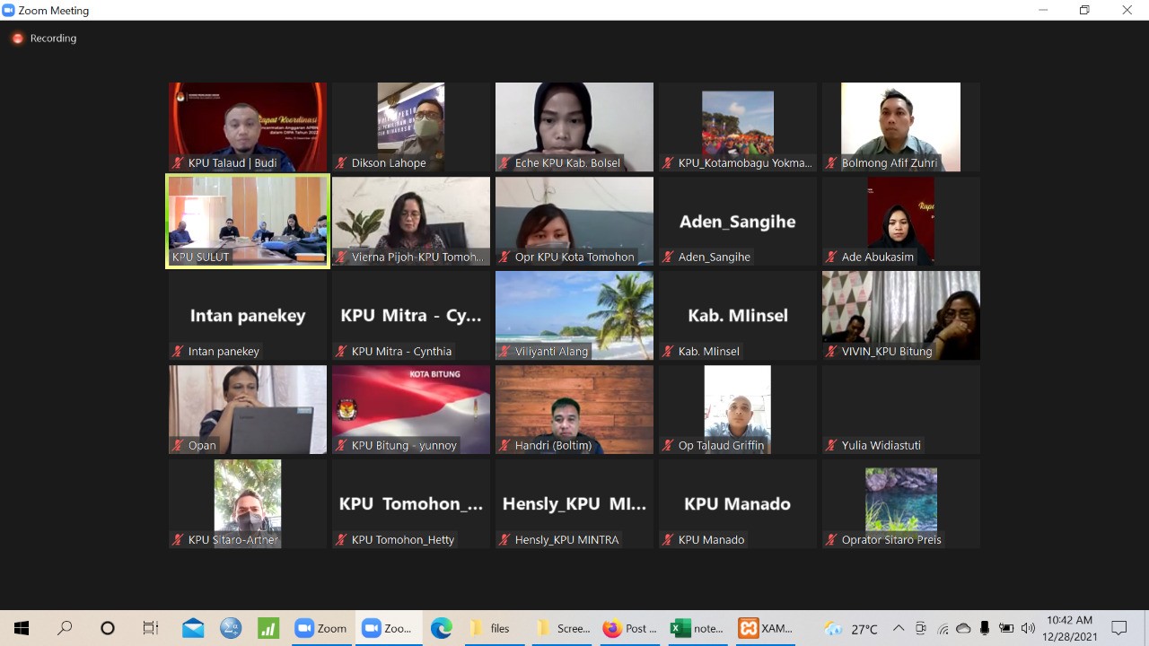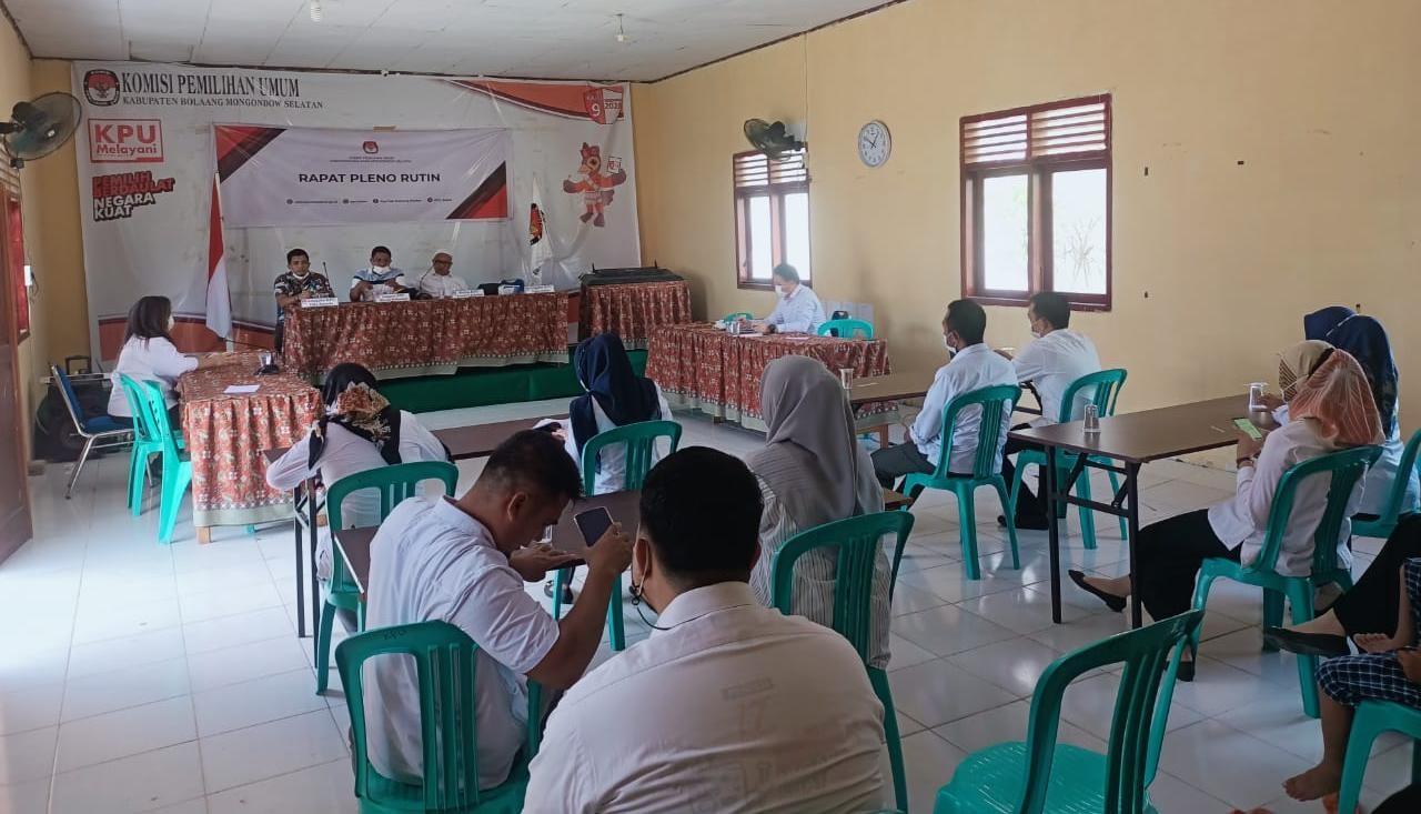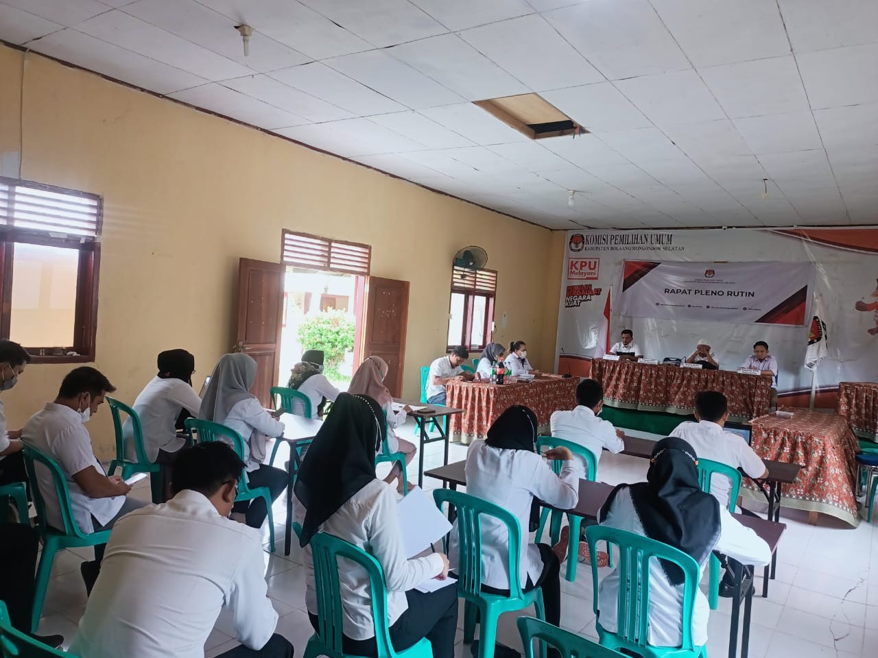 Bolaang Uki – KPU Kabupaten Bolaang Mongondow Selatan melaksanakan Rapat Pleno Rutin terakhir di Tahun 2021 pada Selasa Sore (28/12) di Aula Sekretariat KPU Kabupaten Bolaang Mongondow Selatan. Dibuka secara langsung oleh Ketua KPU Kabupaten Bolaang Mongondow Selatan, kegiatan tersebut dihadiri oleh seluruh unsur KPU Kabupaten Bolaang Mongondow Selatan mulai dari Anggota, Sekertaris, Kasubbag, Pelaksana hingga PPNPN.