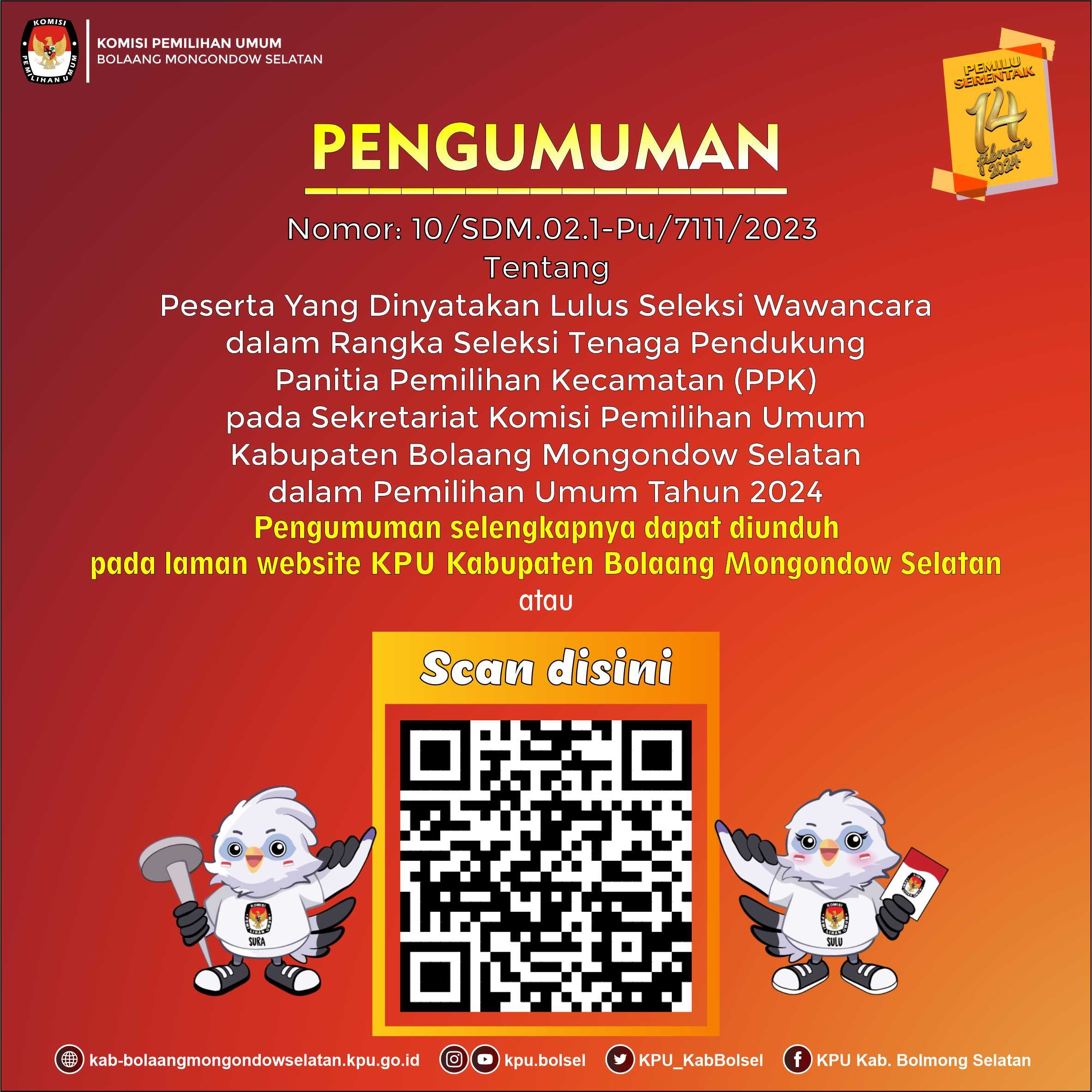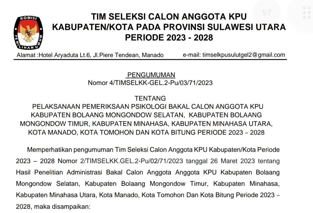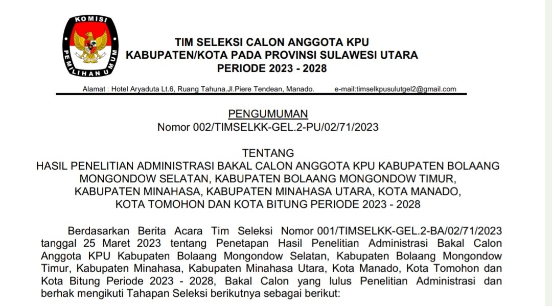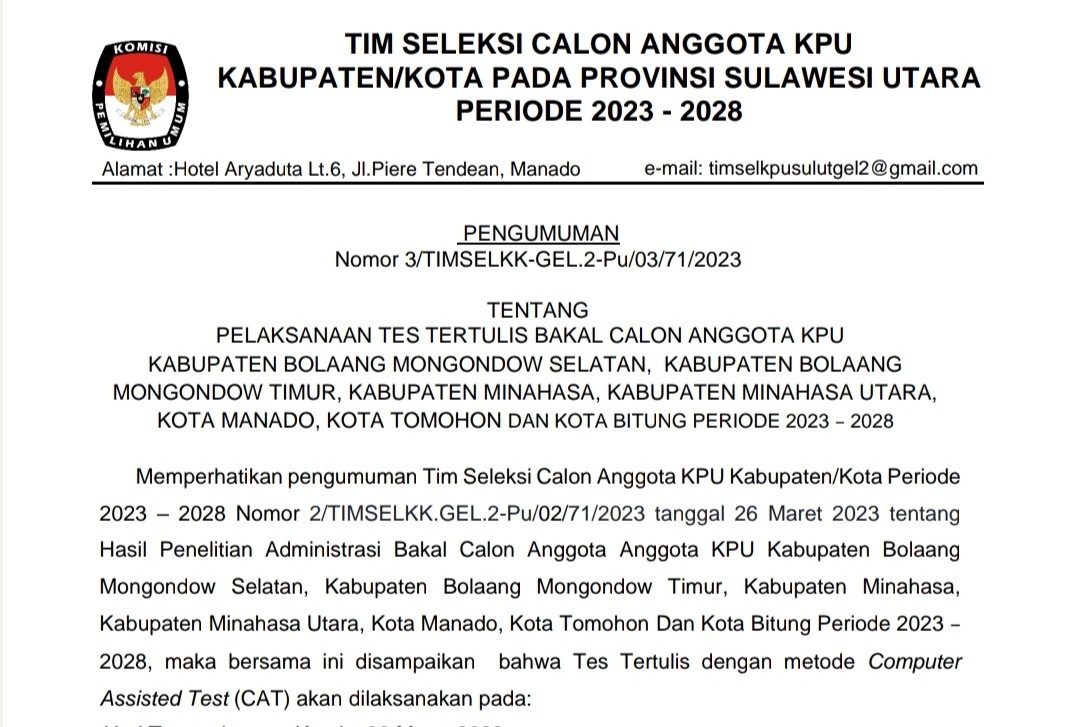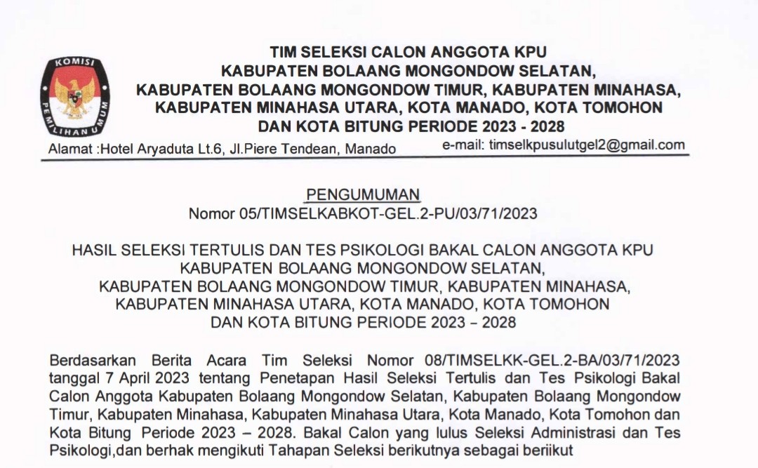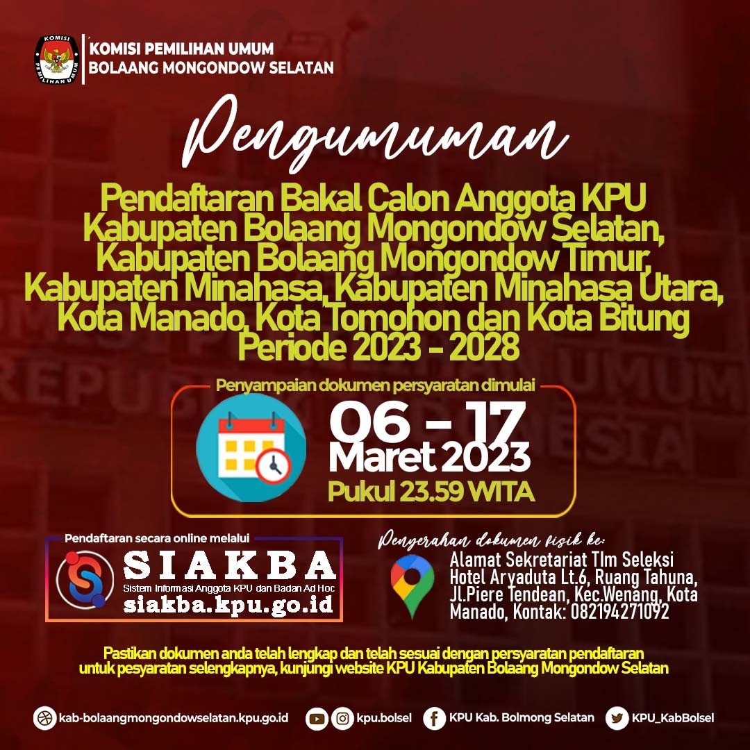 Berdasarkan Keputusan KPU Nomor 126 Tahun 2023 tentang Jadwal Tahapan Seleksi Calon Anggota KPU Kabupaten/Kota Untuk 118 (Seratus Delapan Belas) Kabupaten/Kota Pada 15 (Lima Belas) Provinsi Periode 2023 - 2028, dengan ini Tim Seleksi Calon Anggota KPU Kabupaten Bolaang Mongondow Selatan, Kabupaten Bolaang Mongondow Timur, Kabupaten Minahasa, Kabupaten Minahasa Utara, Kota Manado, Kota Tomohon dan Kota Bitung Periode 2023 - 2028 mengundang Warga Negara Indonesia yang memenuhi persyaratan untuk mendaftarkan diri menjadi Calon Anggota KPU Kabupaten/Kota: a. Kabupaten Bolaang Mongondow Selatan Periode 2023 – 2028; b. Kabupaten Bolaang Mongondow Timur Periode 2023 – 2028; c. Kabupaten Minahasa Periode 2023 – 2028; d. Kabupaten Minahasa Utara Periode 2023 – 2028; e. Kota Manado Periode 2023 – 2028; f. Kota Tomohon Periode 2023 – 2028;dan g. Kota Bitung Periode 2023 – 2028. dengan ketentuan sebagai berikut: