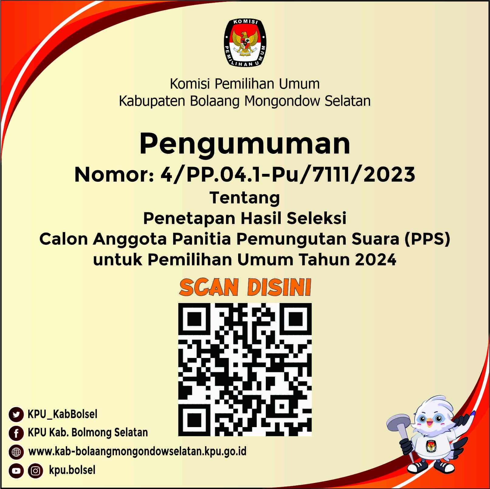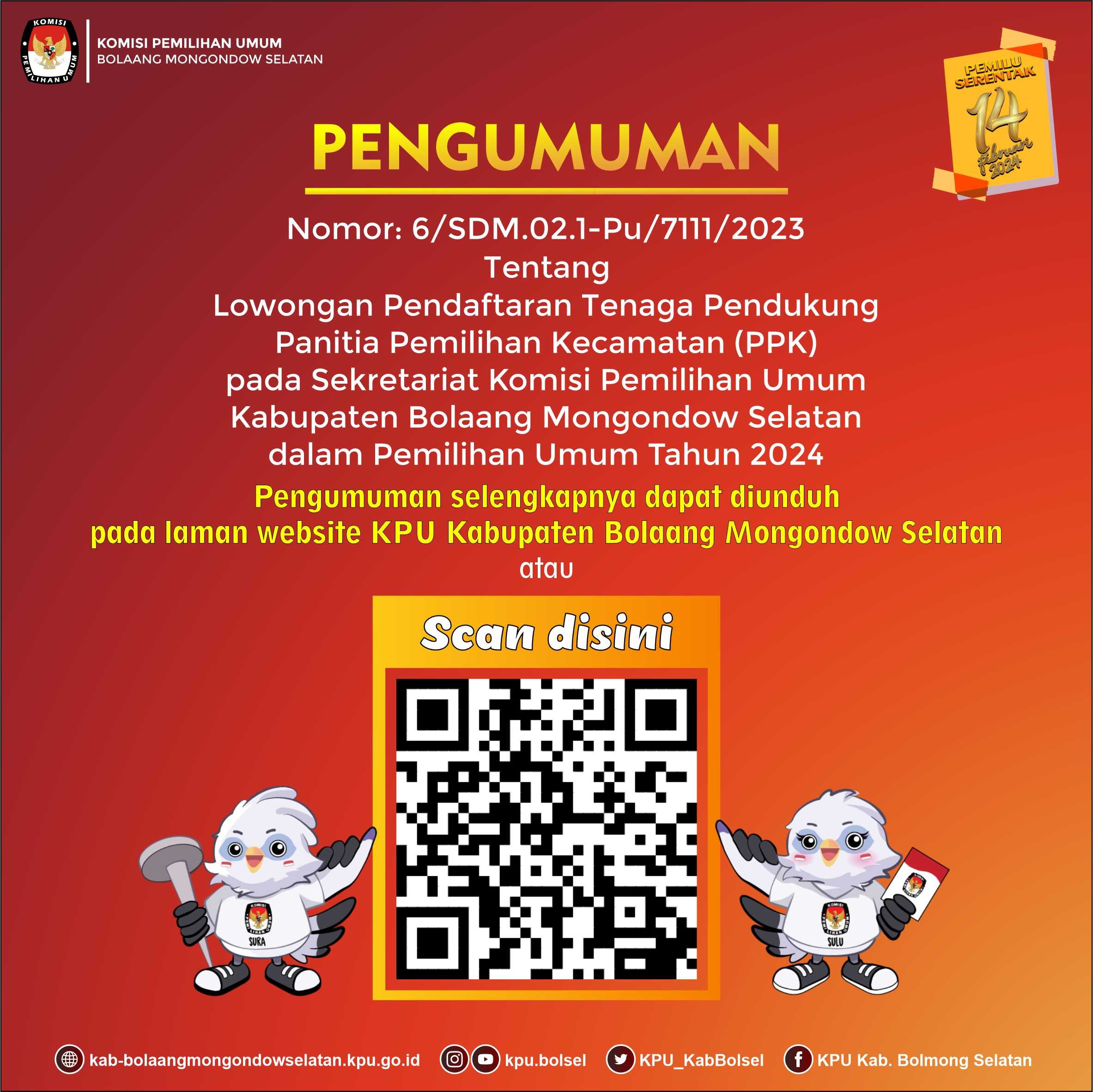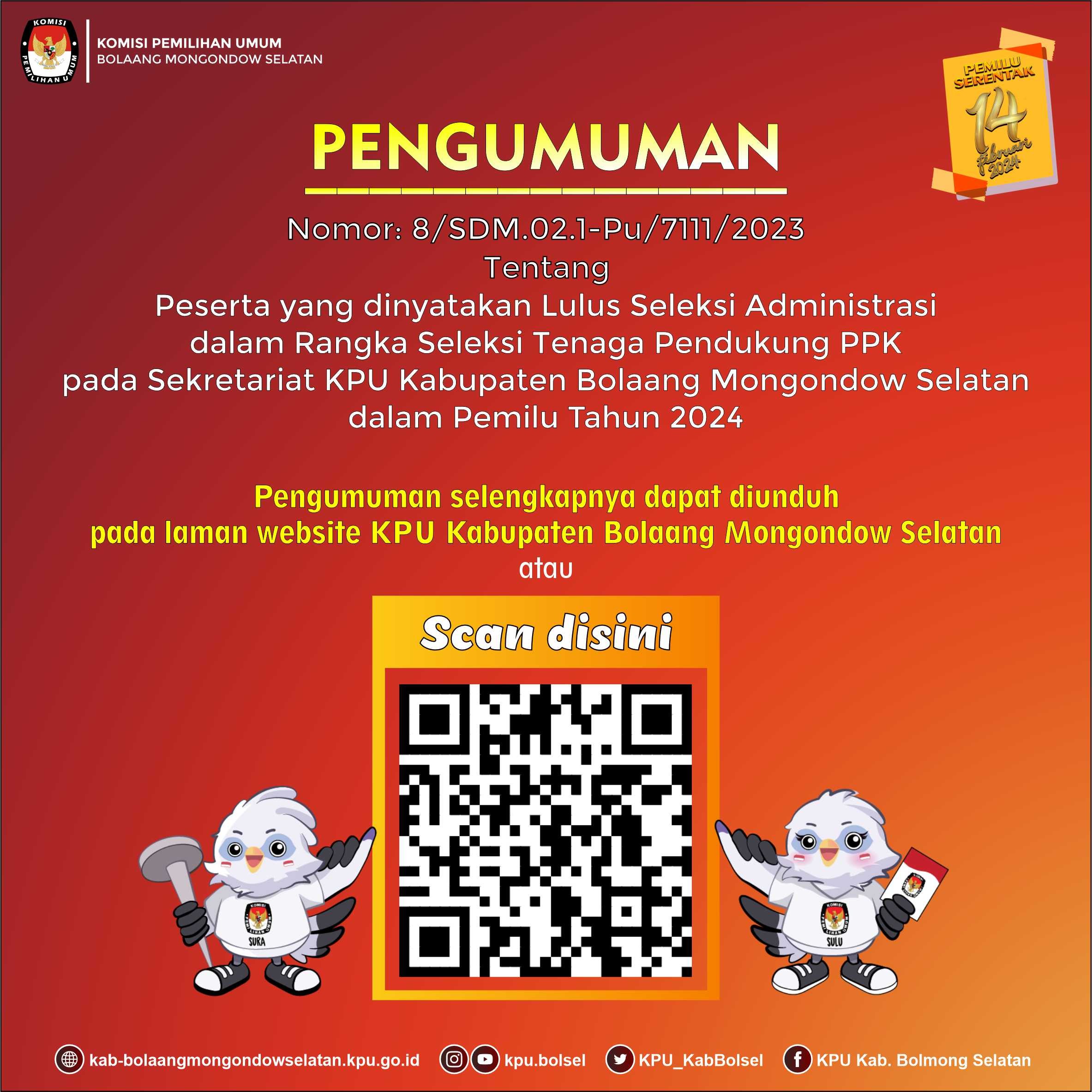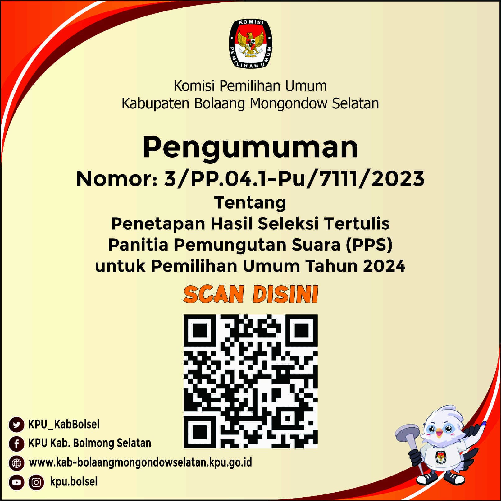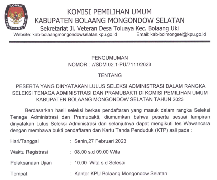 Sehubungan dengan hal tersebut di atas, KPU Kabupaten Bolaang Mongondow Selatan mengundang calon anggota Panitia Pemungutan Suara yang dinyatakan Lulus tahap Seleksi Tertulis untuk hadir dalam tahap seleksi wawancara pada: