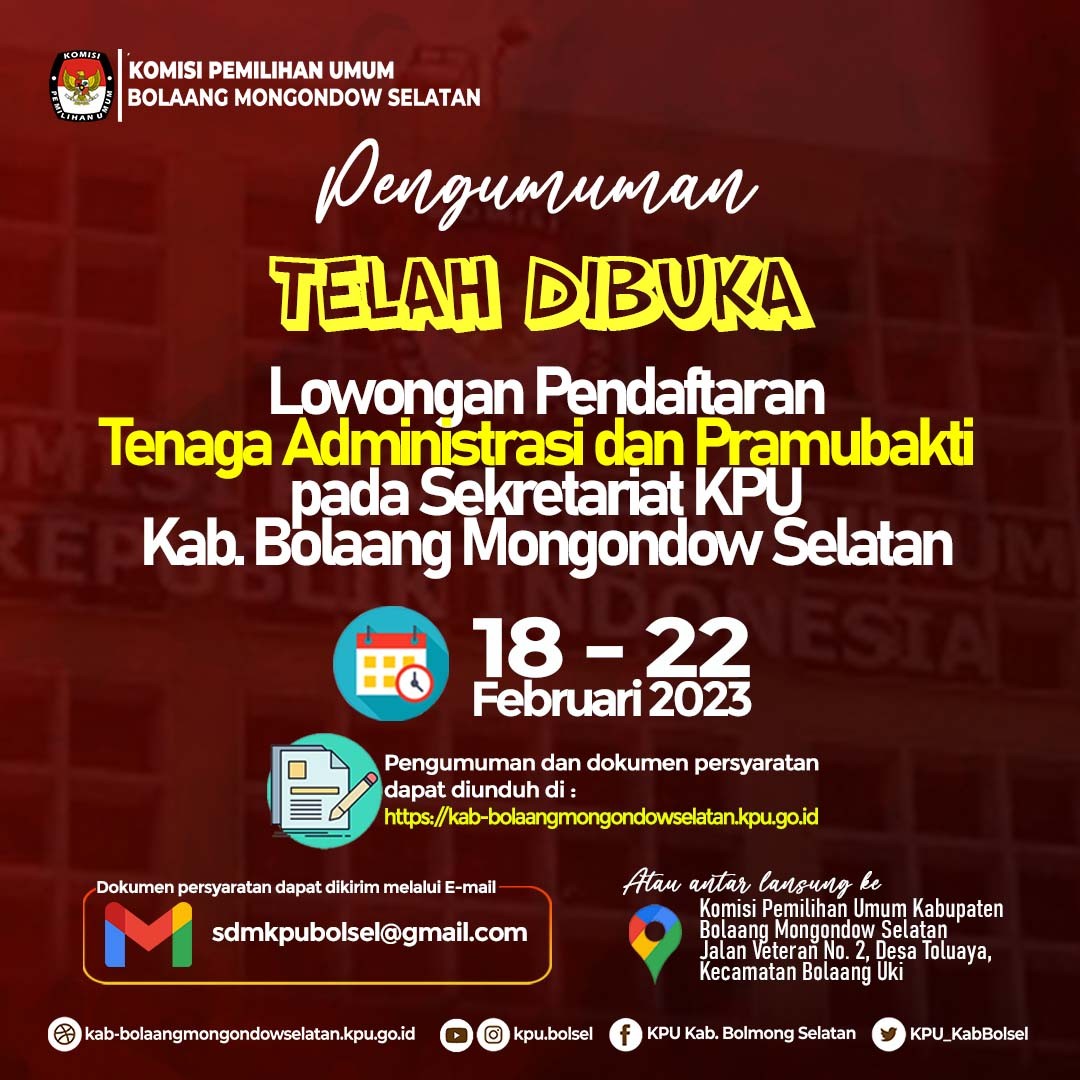 Tempat : Kantor KPU Kabupaten Bolaang Mongondow Selatan Jln. Veteran Nomor 2, Desa Toluaya Kec. Bolaang Uki