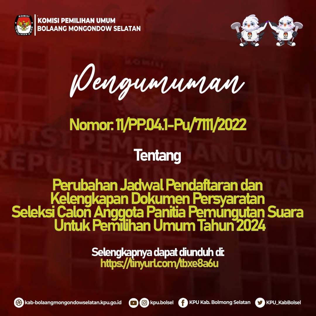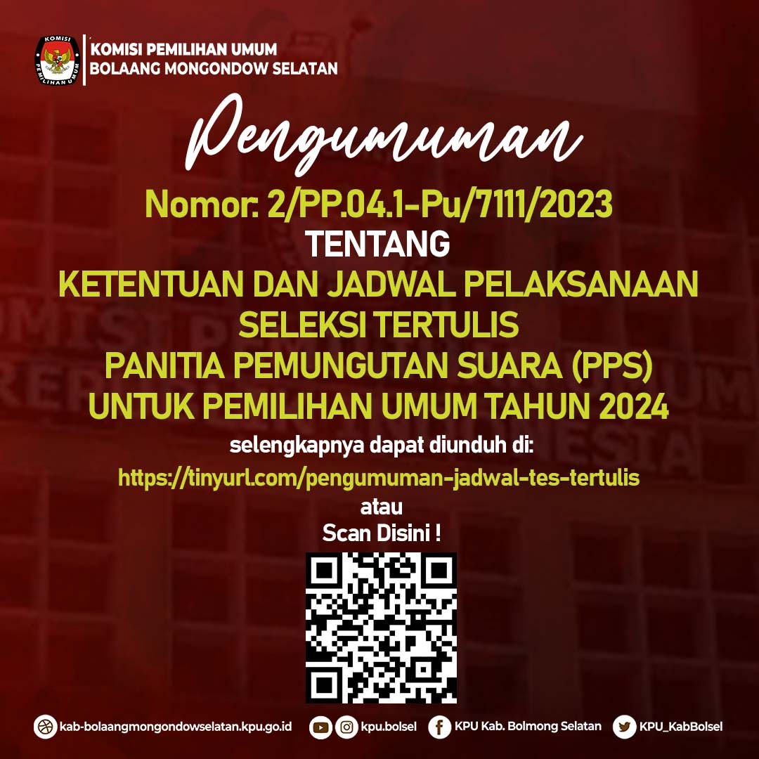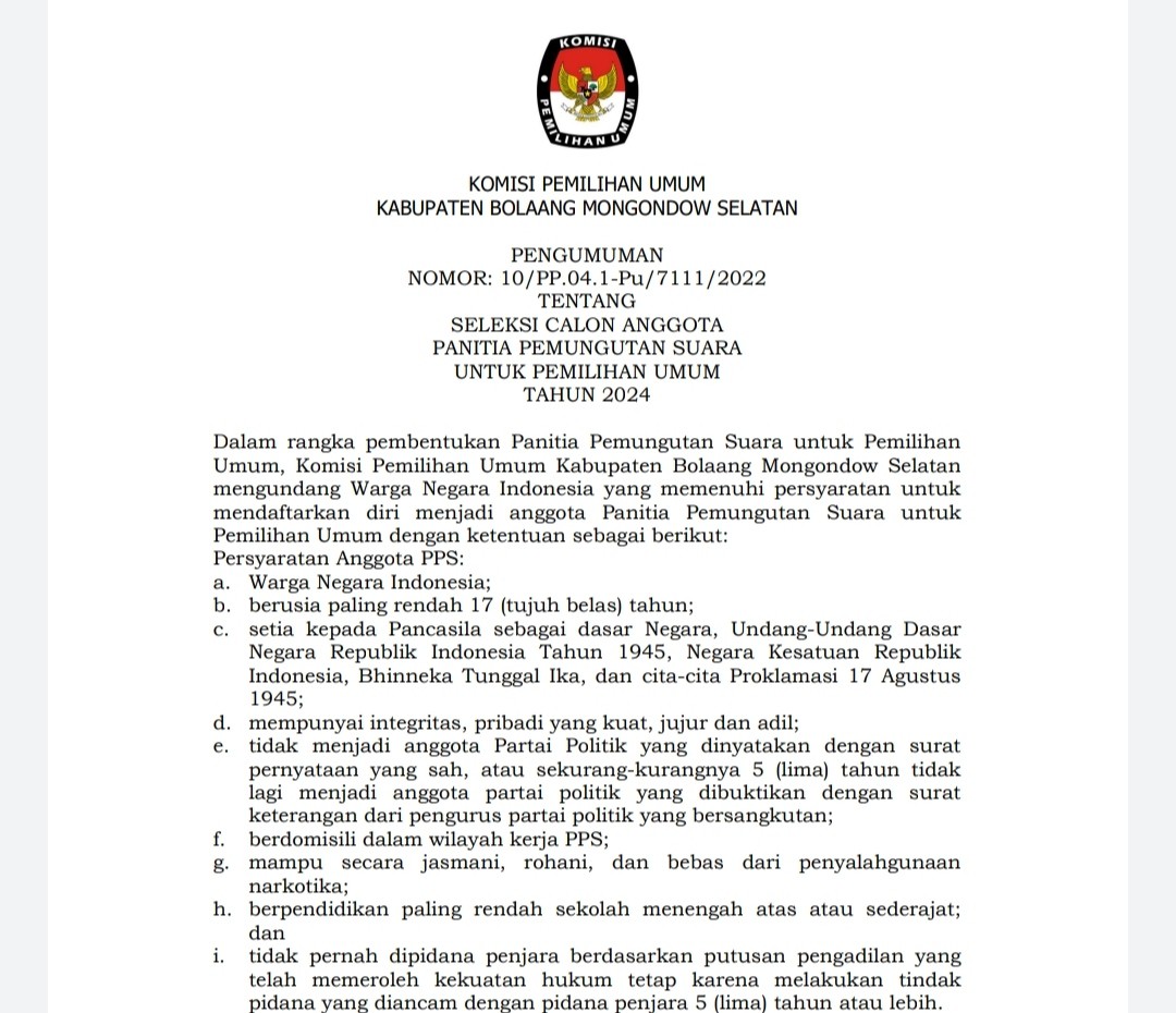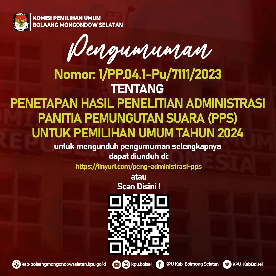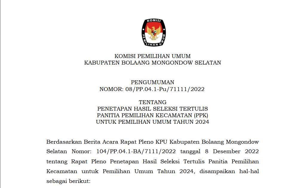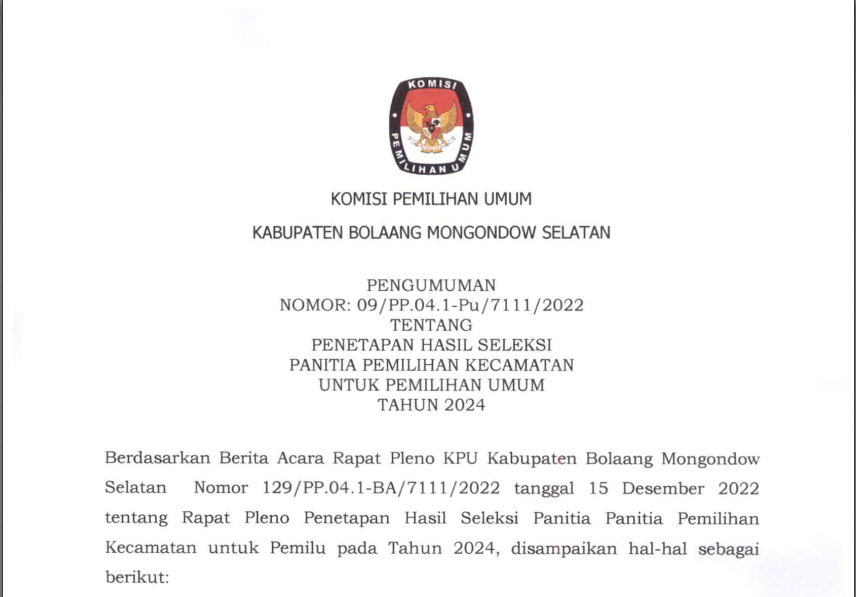 KOMISI PEMILIHAN UMUM KABUPATEN BOLAANG MONGONDOW SELATAN PENGUMUMAN NOMOR: 1/PP.04.1-Pu/7111/2023 TENTANG PENETAPAN HASIL SELEKSI ADMINISTRASI PANITIA PEMUNGUTAN SUARA UNTUK PEMILIHAN UMUM TAHUN 2024 Berdasarkan Berita Acara Rapat Pleno KPU Kabupaten Bolaang Mongondow Selatan Nomor 1/PP.04.1-BA/7111/2023 tanggal 3 Januari 2023 tentang Penetapan Hasil Penelitian Administrasi Calon Anggota Panitia Pemungutan Suara (PPS) Pada Pemilihan Umum Tahun 2024, disampaikan hal-hal sebagai berikut: KPU Kabupaten Bolaang Mongondow Selatan telah melaksanakan tahapan penelitian administrasi pembentukan Panitia Pemungutan Suara untuk Pemilu Tahun 2024 pada tanggal 19 Desember 2022 sampai dengan 2 Januari 2023; KPU Kabupaten Bolaang Mongondow Selatan menetapkan hasil penelitian administrasi pembentukan Panitia Pemungutan Suara untuk Pemilu Tahun 2024 sebagaimana Lampiran; Mengenai jadwal dan ketentuan pelaksanaan Tes Tertulis akan diumumkan kemudian; KPU Kabupaten Bolaang Mongondow Selatan menerima tanggapan dan masukan masyarakat terhadap calon anggota PPK yang dinyatakan lulus penelitian administrasi secara tertulis melalui email siakba.kpu.bolsel@gmail.com serta melalui kotak tanggapan dan masukan masyarakat calon anggota badan adhoc di Kantor KPU Kabupaten Bolaang Mongondow Selatan dengan menyertakan identitas diri (KTP el) sejak tanggal 3 s/d. 14 Januari 2023. Demikian pengumuman ini disampaikan untuk diketahui. Selengkapnya dapat diunduh disini.