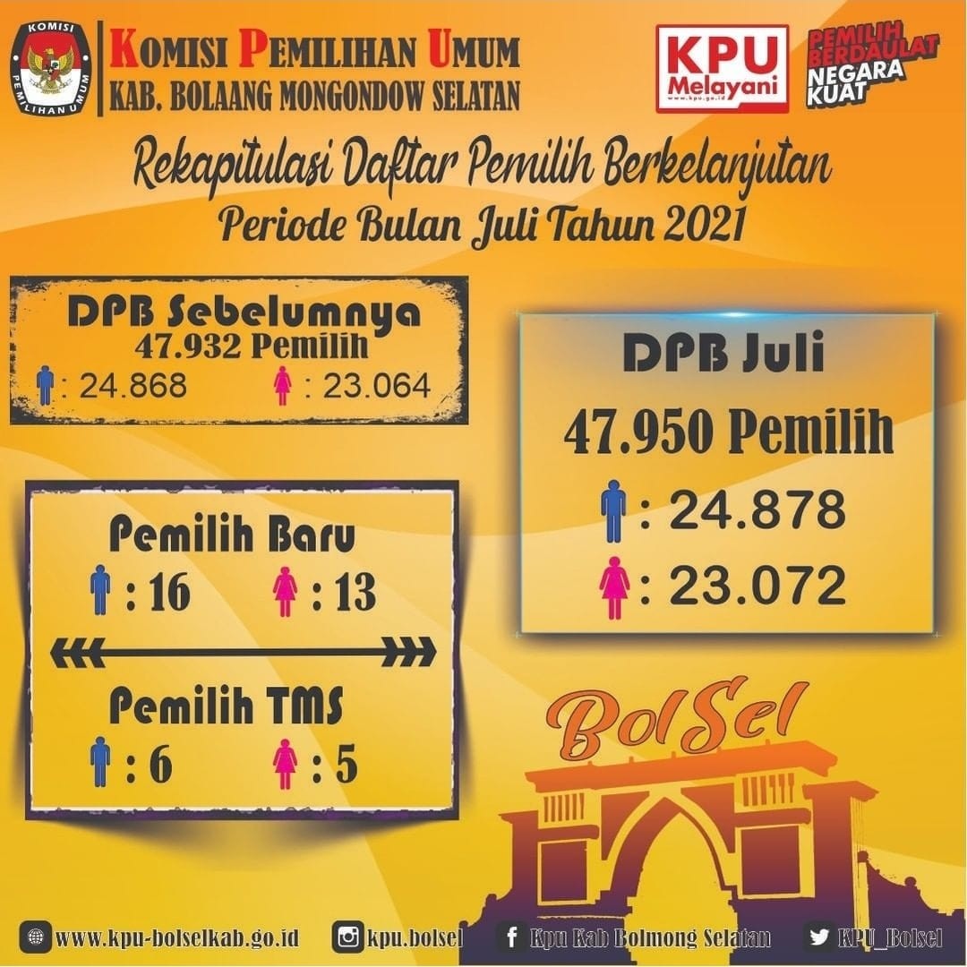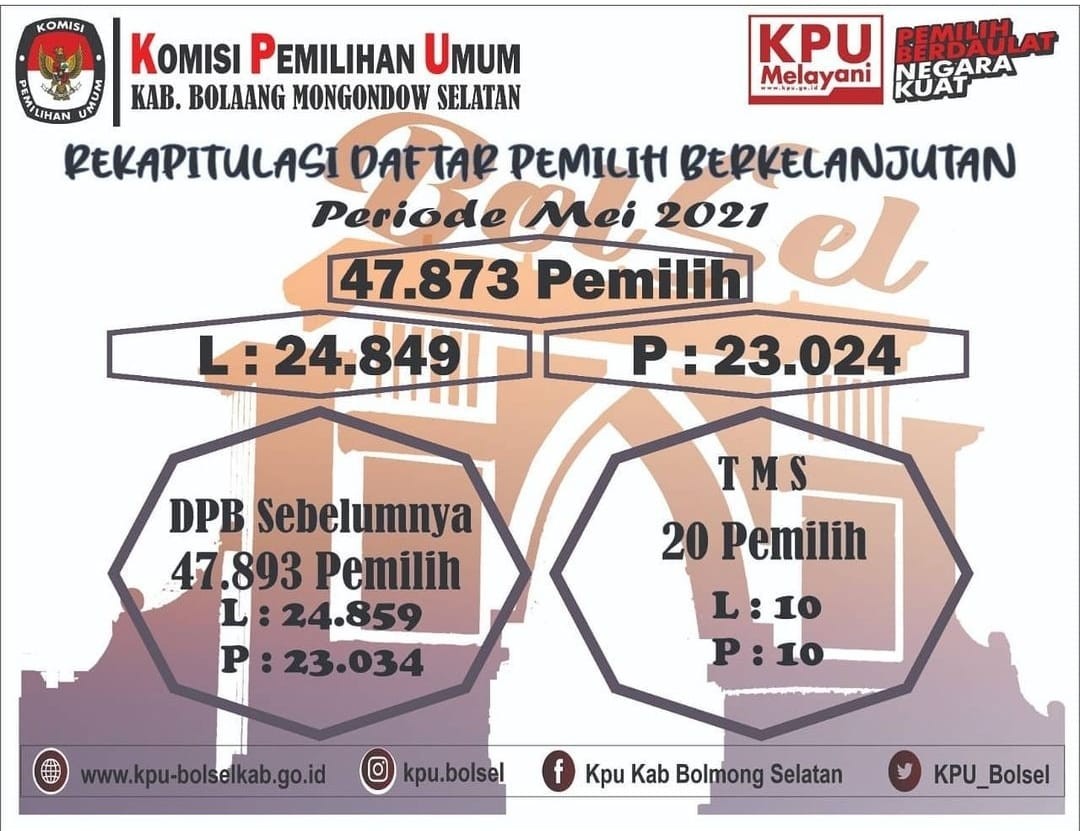 Bolaang Uki - 2 Juli 2021, KPU Kabupaten Bolaang Mongondow Selatan melaksanakan Rapat Koordinasi Pemutakhiran Daftar Pemilih Berkelanjutan (DPTb) yang dihadiri secara langsung oleh beberapa stakeholder diantaranya perwakilan dari Badan Pengawas Pemilu, perwakilan dari Dinas Kependudukan dan Catatan Sipil, Kepala Kantor Kesatuan Bangsa dan Politik, serta perwakilan dari Partai Demokrasi Indonesia Perjuangan. Ketua KPU Bolaang Mongondow Selatan Stanly E. Kakunsi dalam pembukaannya menyampaikan bahwa kegiatan ini akan dilaksanakan secara rutin tiap awal bulan dalam rangka untuk mengupdate data pemilih. Sedangkan Ketua Divisi Perencanaan, Data dan Informasi, Hirsan Mohamad mengungkapkan dalam sambutanya menyampaikan bahwa kordinasi dengan stakhoder sangatlah penting. sebab KPU tidak bisa bekerja sendiri, melaikan peran daripada stakeholder sangatlah penting dalam pemutakhiran data pemilih berkelanjutan Syukri V. Gobel selaku Kepala Kantor Kesbangpol menyampaikan bahwa pemutakhiran data berkelanjutan ini bertujuan untuk mendapatkan data yang lebih update dan berkualitas, dan kita ketahui bersama bahwa data kependudukan itu sangat dinamis, tiap hari ada kematian dan kelahiran hingga pensiunan, jadi ini memerlukan peran aktif masyarakat untuk sesegera mungkin melaporkan kematian dan pensiun ke disdukcapil, ungkapnya. Kegiatan tersebut dilanjutkan dengan pembacaan penandatanganan dan penyerahan Berita Acara Nomor: 11/PL.02.1-BA/7111/KPU-Kab/VI/2021 Tentang Rapat Koordinasi Datfar Pemilih Berkelanjutan Tahun 2021 periode bulan Juni tahun 2021 kepada stakeholder yang hadir namun pengurus partai politik yang tidak hadir akan tetap disampaikan berita acara tersebut. Ketua KPU Bolaang Mongondow Selatan berharap semua pemangku kepentingan dalam pemutakhiran data pemilih ini harus lebih aktif, untuk membantu kami dalam melaksanakan perintah Undang-Undang. Dalam rapat tersebut tak lupa Ketua Divisi Teknis dan Parmas, Fijey Bumulo menyampaikan bahwa dalam waktu dekat KPU Bolaang Mongondow Selatan akan melaksanakan program desa peduli pemilih, dan perlu kita ketahui bahwa Bolsel akan menjadi pilot project se Sulawesi Utara, sehingga kami dari KPU Bolsel sangat mengharapkan dukungan dari pemerintah daerah dalam pelaksanaan kegiatan tersebut. Perlu diketahui Bersama bahwa, Rapat Koordinasi ini dilaksanakan berdasarkan Surat Ketua KPU RI Nomor: 132/PL.02-SD/01/KPU/II/2021 tanggal 4 Februari 2021 perihal Pemutakhiran Data Pemilih Berkelanjutan Tahun 2021, sebagaimana telah diubah melalui Surat Ketua KPU RI Nomor: 366/PL.02-SD/01/KPU/IV/2021 tanggal 21 April 2021 perihal Perubahan Surat Ketua KPU RI Nomor: 132/PL.02-SD/01/KPU/II/2021 tanggal 4 Februari 2021 perihal Pemutakhiran Data Pemilih Berkelanjutan Tahun 2021 sebagai upaya KPU RI dalam mengimplementasikan amanat UU No. 7 Tahun 2017 terkait pemutakhiran data pemilih. berikut : PENGUMUMAN DATA PEMILIH PERUBAHAN BULAN JUNI TAHUN 2021 DAFTAR PERUBAHAN PEMILIH HASIL PDPB TAHUN 2021