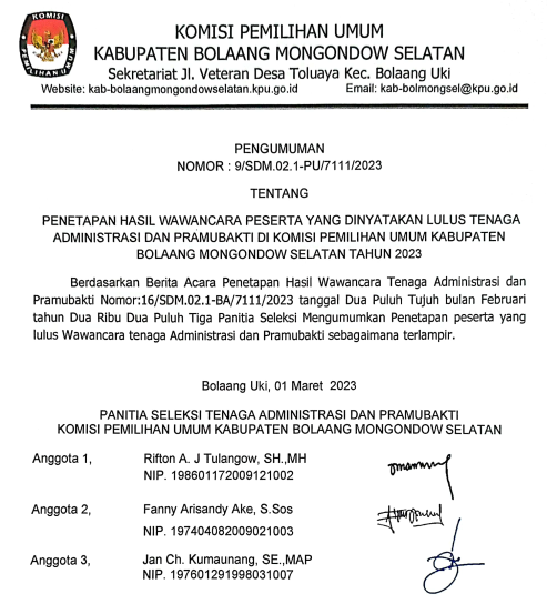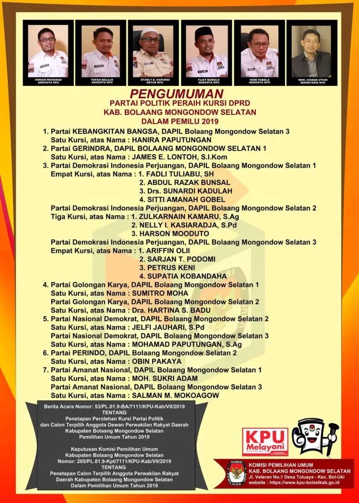 kpu-bolsel-Komisi Pemilihan Umum(KPU) Kabupaten Bolaang Mongondow Selatan telah menetapkan Surat Keputusan (SK) No. 211/PL.02.2-Kpt 7111/kab/X/2019 syarat dukungan minimum calon perseorangan dalam pemilihan bupati dan wakil bupati tahun 2020 dalam rapat pleno yang digelar, Sabtu(26/10).