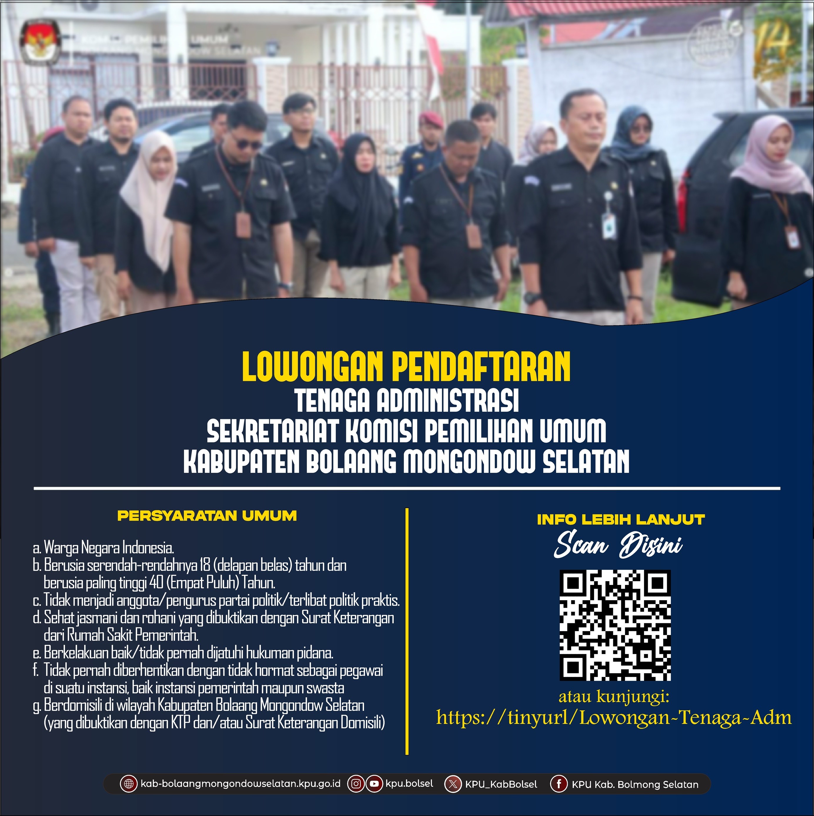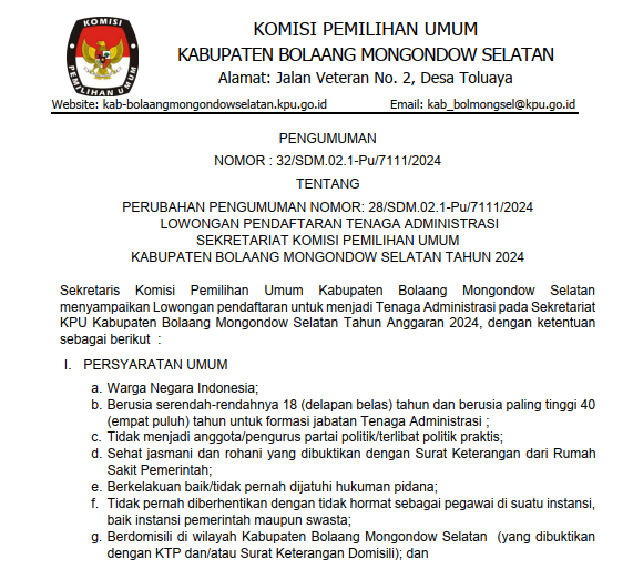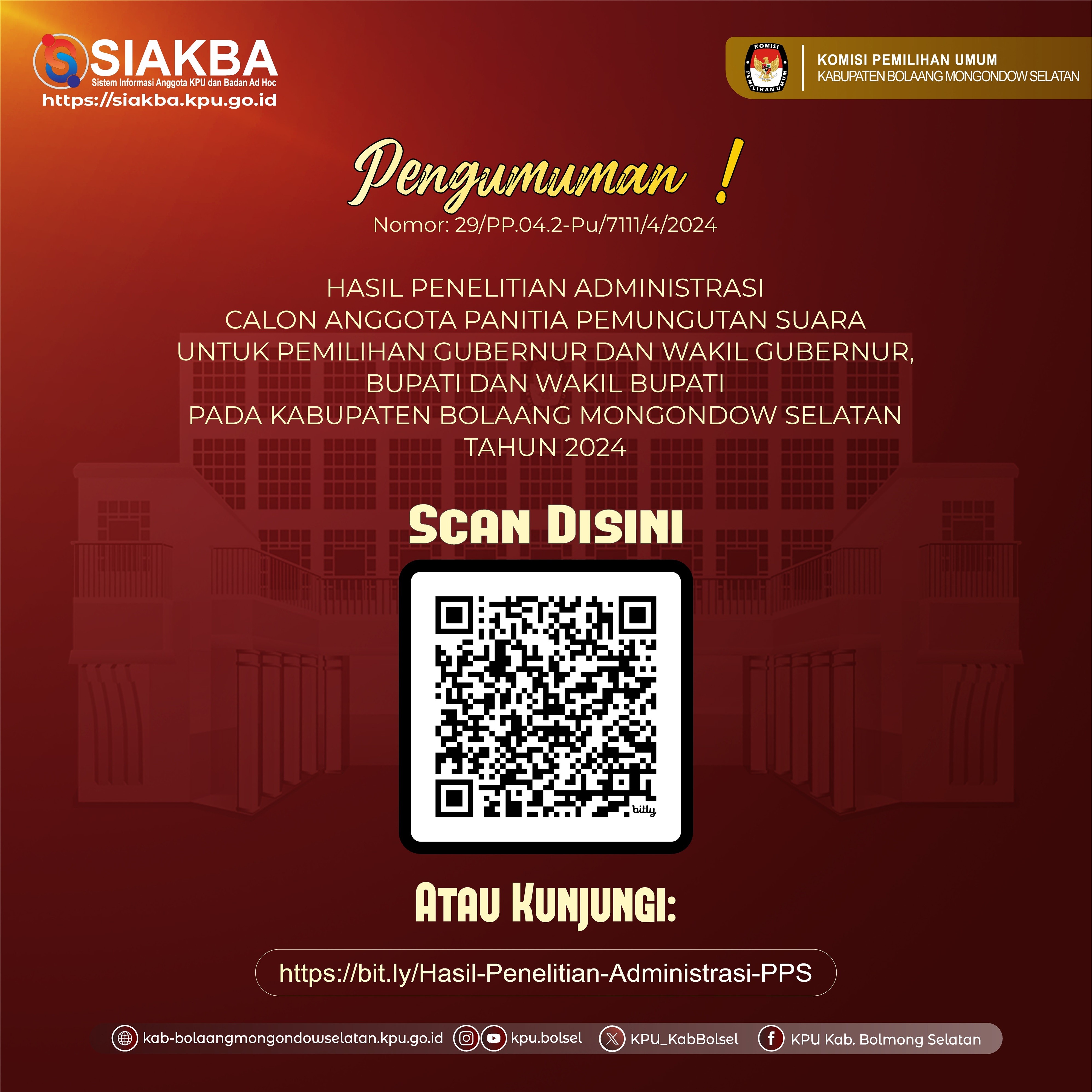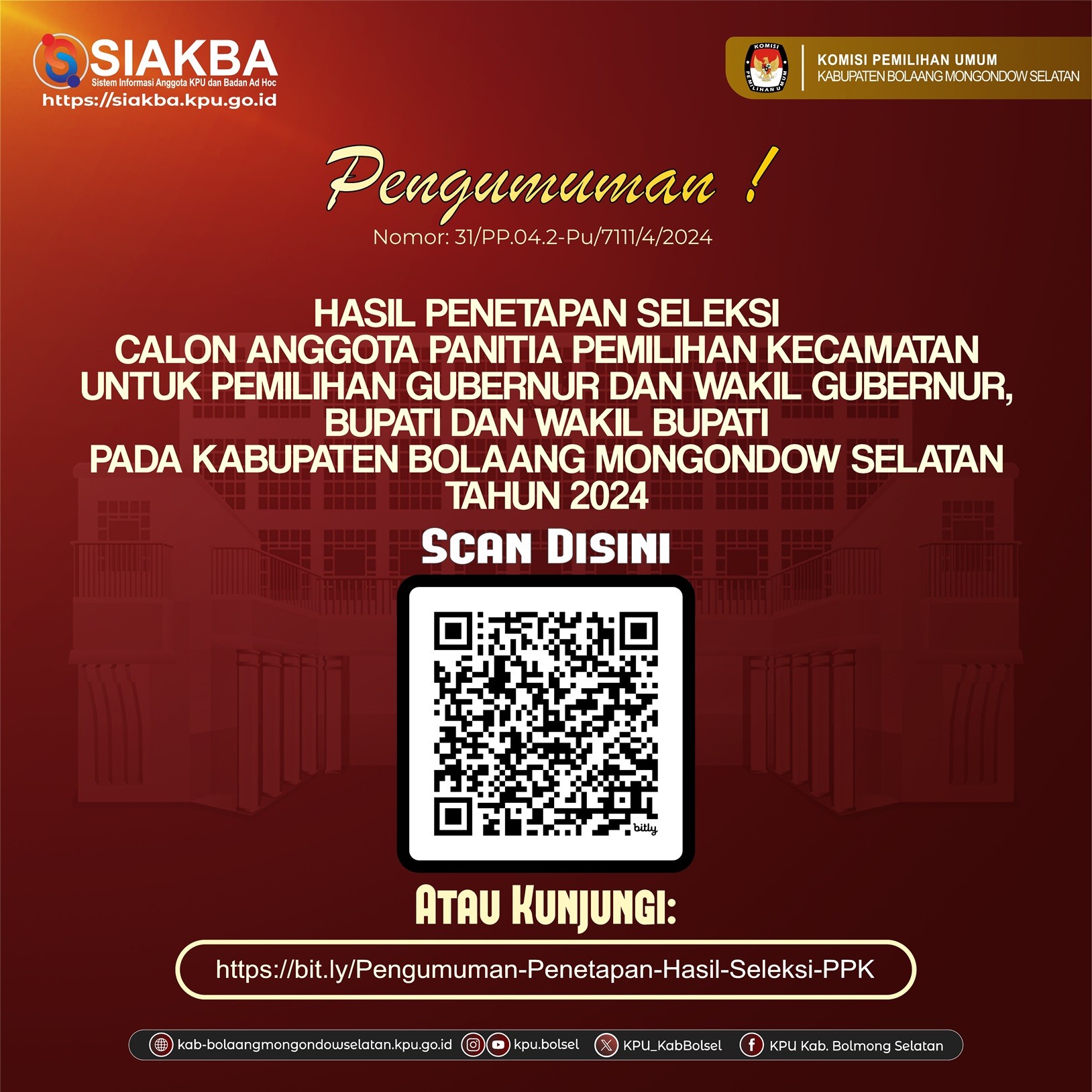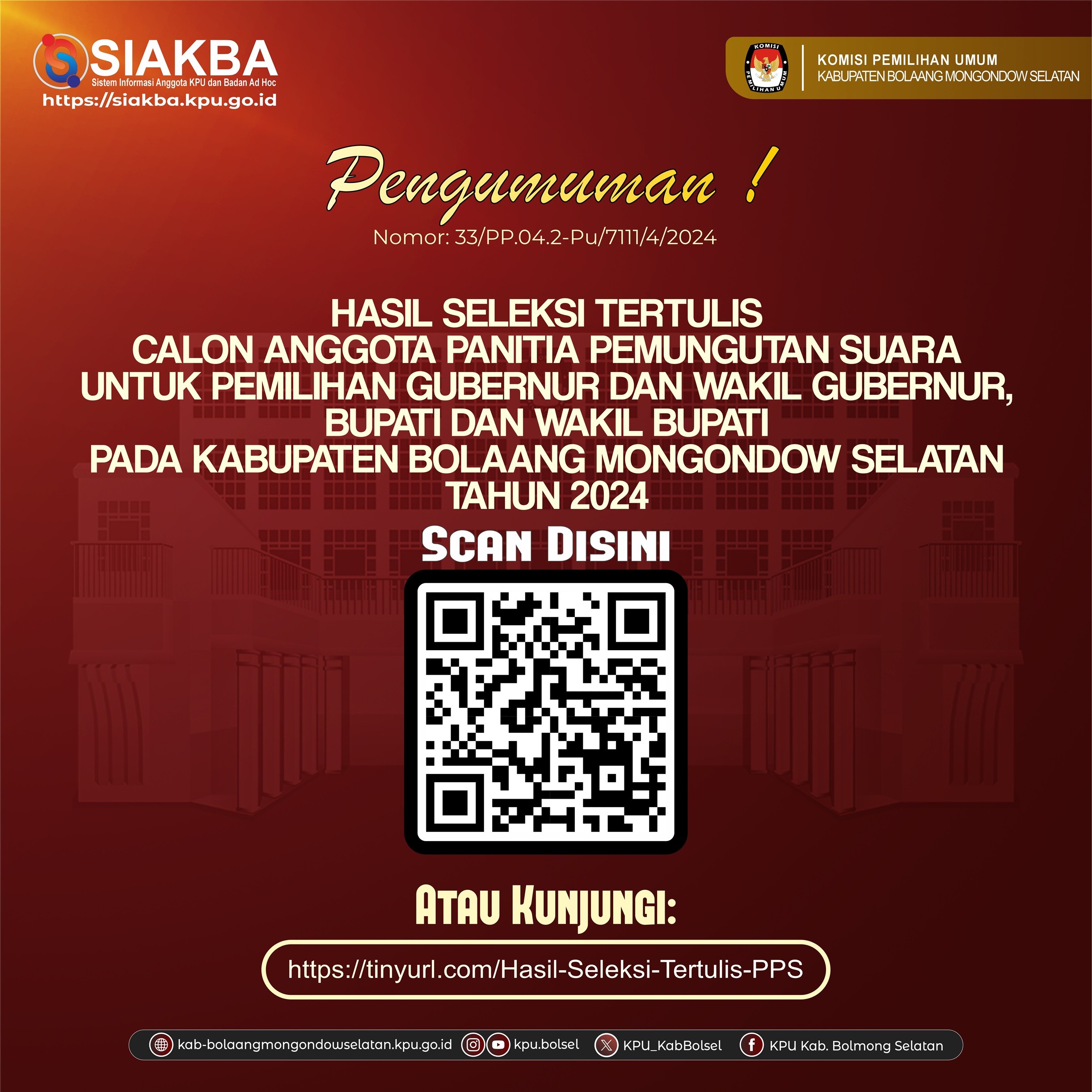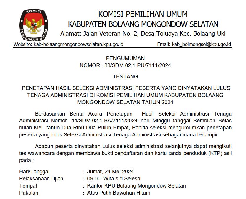 Sehubungan dengan Komisi Pemilihan Umum Kabupaten Bolaang Mongondow Selatan telah melaksanakan tahapan Seleksi Tertulis Calon Anggota Panitia Pemungutan Suara pada untuk Pemilihan Gubernur dan Wakil Gubernur, Bupati dan Wakil Bupati Tahun 2024, disampaikan beberapa hal sebagai berikut: Pelaksanaan Seleksi Tertulis Calon Anggota Panitia Pemungutan Suara untuk Pemilihan Gubernur dan Wakil Gubernur, Bupati dan Wakil Bupati Tahun 2024 telah dilaksanakan pada tanggal 18 Mei 2024 bertempat di SMP Negeri 1 Bolaang Uki dan SD Negeri 2 Molibagu. Hasil Seleksi Tertulis Calon Anggota Panitia Pemungutan Suara untuk Pemilihan Gubernur dan Wakil Gubernur, Bupati dan Wakil Bupati Tahun 2024 adalah 539 (Lima Ratus Tiga Puluh Sembilan) orang yang dinyatakan Lulus, sebagaimana data terlampir. Sehubungan dengan hal tersebut di atas, Komisi Pemilihan Umum Kabupaten Bolaang Mongondow Selatan mengundang calon anggota Panitia Pemungutan Suara yang dinyatakan lulus untuk hadir dan mengikuti Wawancara Calon Anggota Panitia Pemungutan Suara pada : Selengkannya dapat diunduh DISINI