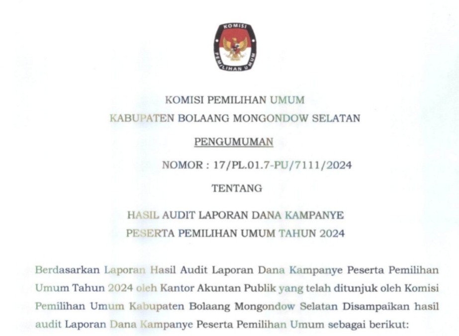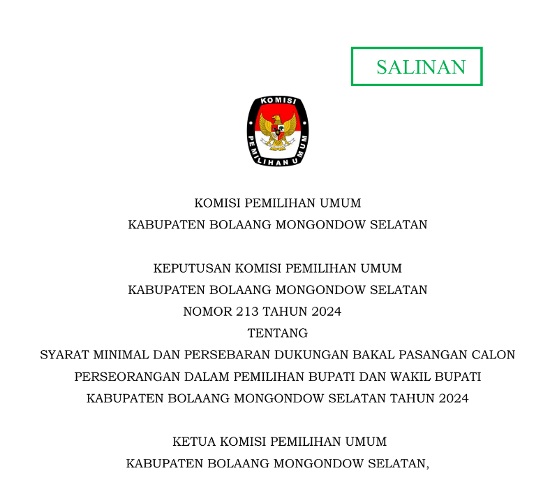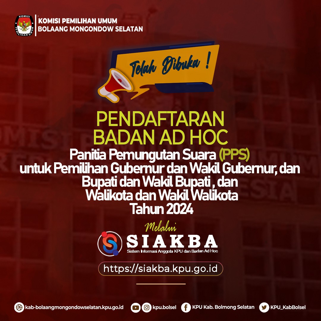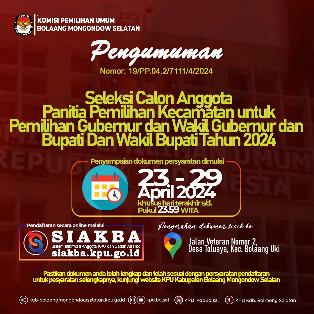 KOMISI PEMILIHAN UMUM KABUPATEN BOLAANG MONGONDOW SELATAN PENGUMUMAN NOMOR: 20/PP.04.2-Pu/7111/4/2024 TENTANG PERPANJANGAN PENDAFTARAN SELEKSI CALON ANGGOTA PANITIA PEMILIHAN KECAMATAN UNTUK PEMILIHAN GUBERNUR DAN WAKIL GUBERNUR, BUPATI DAN WAKIL BUPATI, DAN WALI KOTA DAN WAKIL WALI KOTA PADA KABUPATEN BOLAANG MONGONDOW SELATAN TAHUN 2024 Berdasarkan Keputusan Ketua Komisi Pemilihan Umum Nomor 476 Tahun 2022 tentang Pedoman Teknis Pembentukan Badan Adhoc Penyelenggara Pemilihan Umum dan Pemilihan Gubernur dan Wakil Gubernur Bupati dan Wakil Bupati dan Walikota dan Wakil Walikota, serta Keputusan Ketua Komisi Pemilihan Umum Nomor 476 Tahun 2024 tentang metode pembentukan Panitia Pemilihan Kecamatan dan Panitia Pemungutan Suara dalam Penyelenggaraan Pemilihan Gubernur dan Wakil Gubernur, Bupati dan Wakil Bupati, serta Walikota dan Wakil Walikota Tahun 2024, menyampaikan bahwa perpanjangan pendaftaran dilakukan dalam hal sampai dengan masa pendaftaran berakhir tidak ada peserta yang mendaftar atau kurang dari 2 (dua) kali jumlah PPK yang dibutuhkan, membuka 1 (satu) kali perpanjangan waktu pendaftaran selama 3 (tiga) Hari. Sehubungan dengan hal tersebut, KPU Kabupaten Bolaang Mongondow Selatan membuka perpanjangan waktu pendaftaran seleksi calon anggota PPK sejak tanggal 30 April 2024 sampai dengan tanggal 2 Mei 2024 pada Kecamatan sebagai berikut : Kecamatan Helumo; Kecamatan Tomini; dan Kecamatan Pinolosian Timur; dengan ketentuan persyaratan Anggota Panitia Pemilihan Kecamatan sebagai berikut: Selengkapnya dapat diunduh DISINI Format Dokumen Persyaratan (Format Surat Pendaftaran, Format Daftar Riwayat Hidup, dan Format Surat Pernyataan) dapat diunduh DISINI